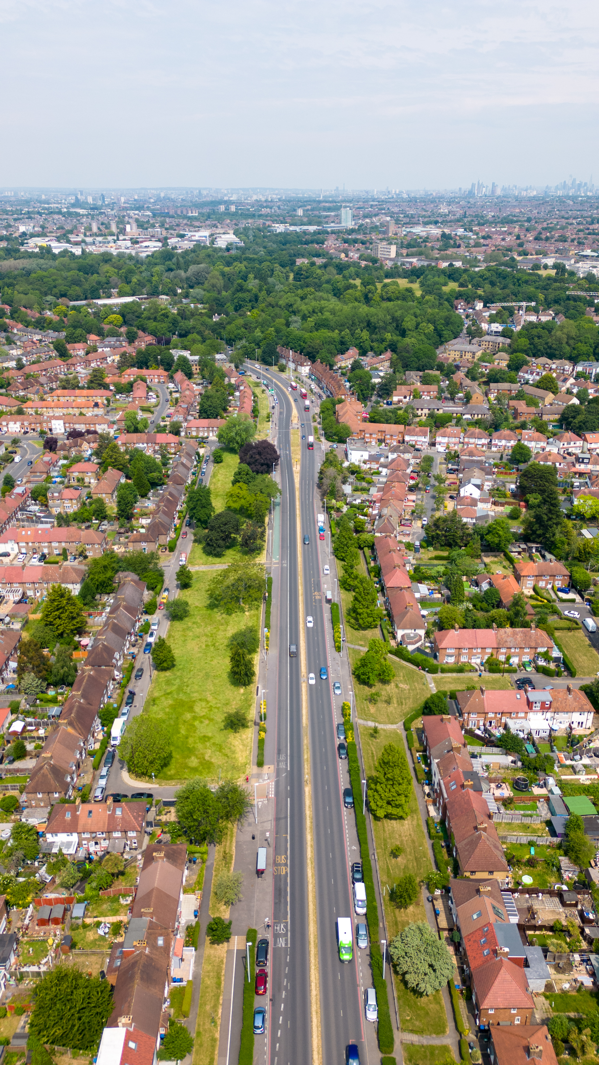 Aerial view of a suburban neighborhood with rows of houses and a central road flanked by green trees in London.