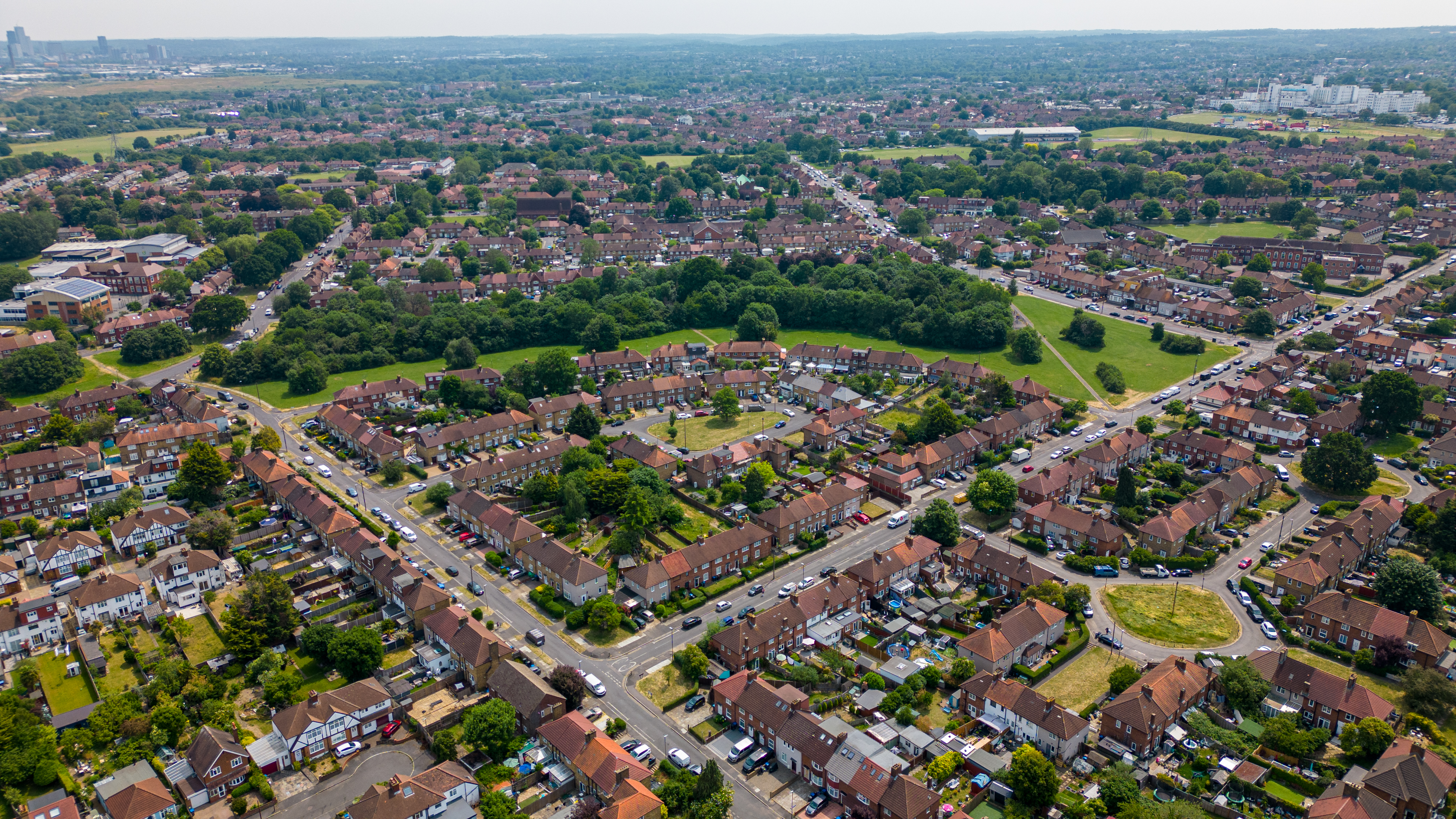 Aerial view of a suburban neighborhood with rows of houses and a central road flanked by green trees in London.