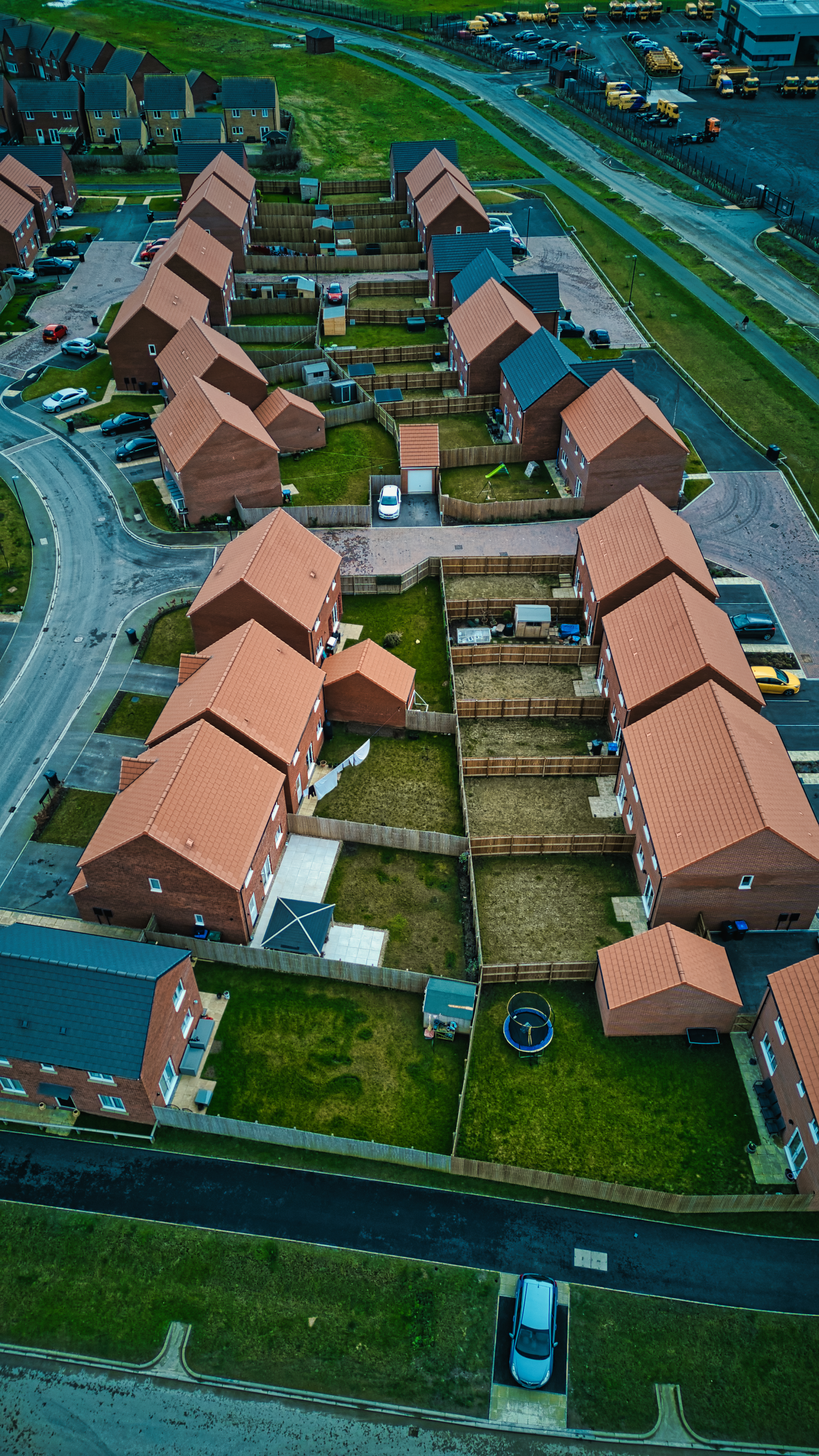 Aerial view of a suburban neighborhood with rows of houses and gardens at dusk.