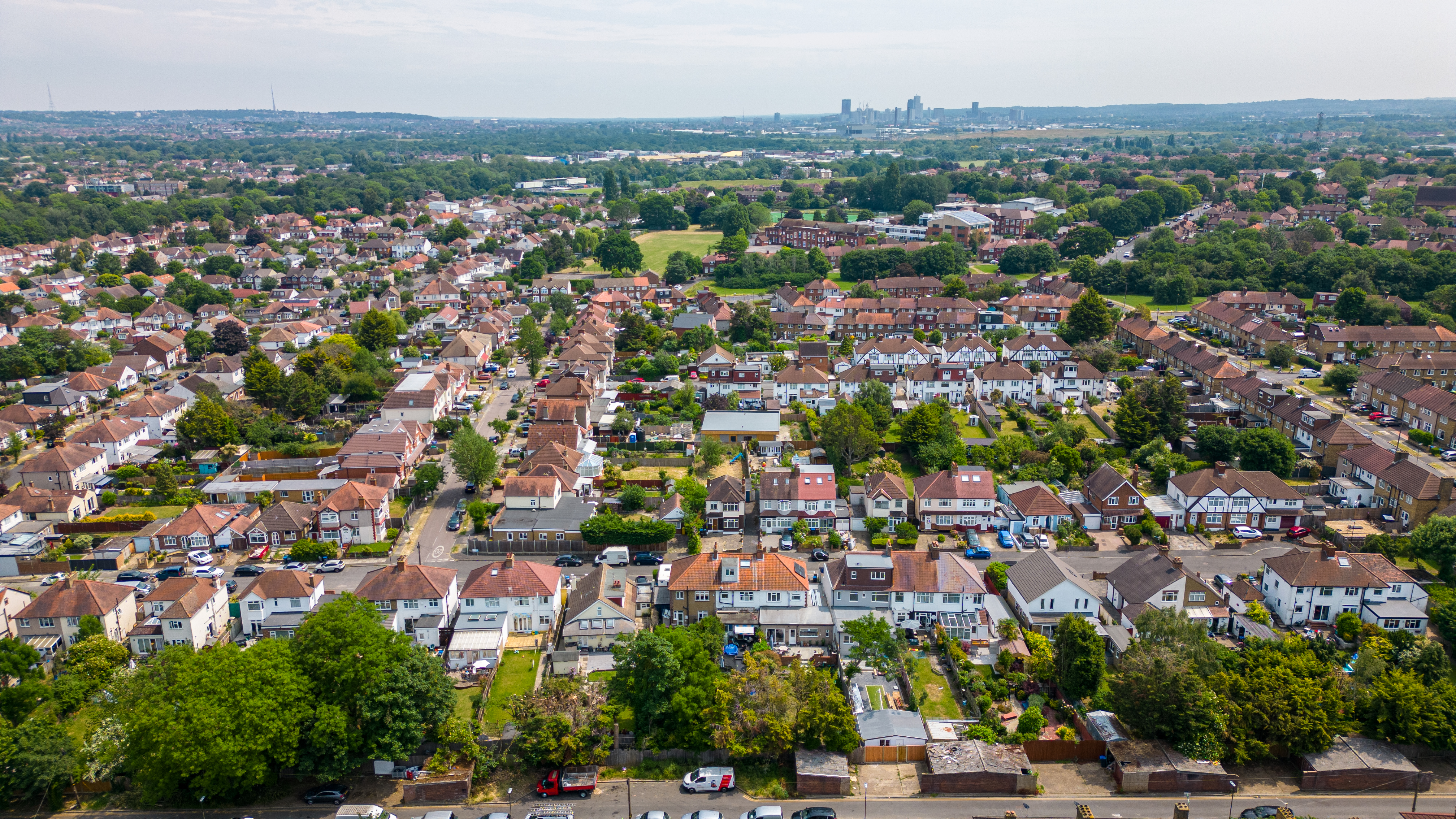 Aerial view of a suburban neighborhood with rows of houses and green trees, city skyline in the distance in London.