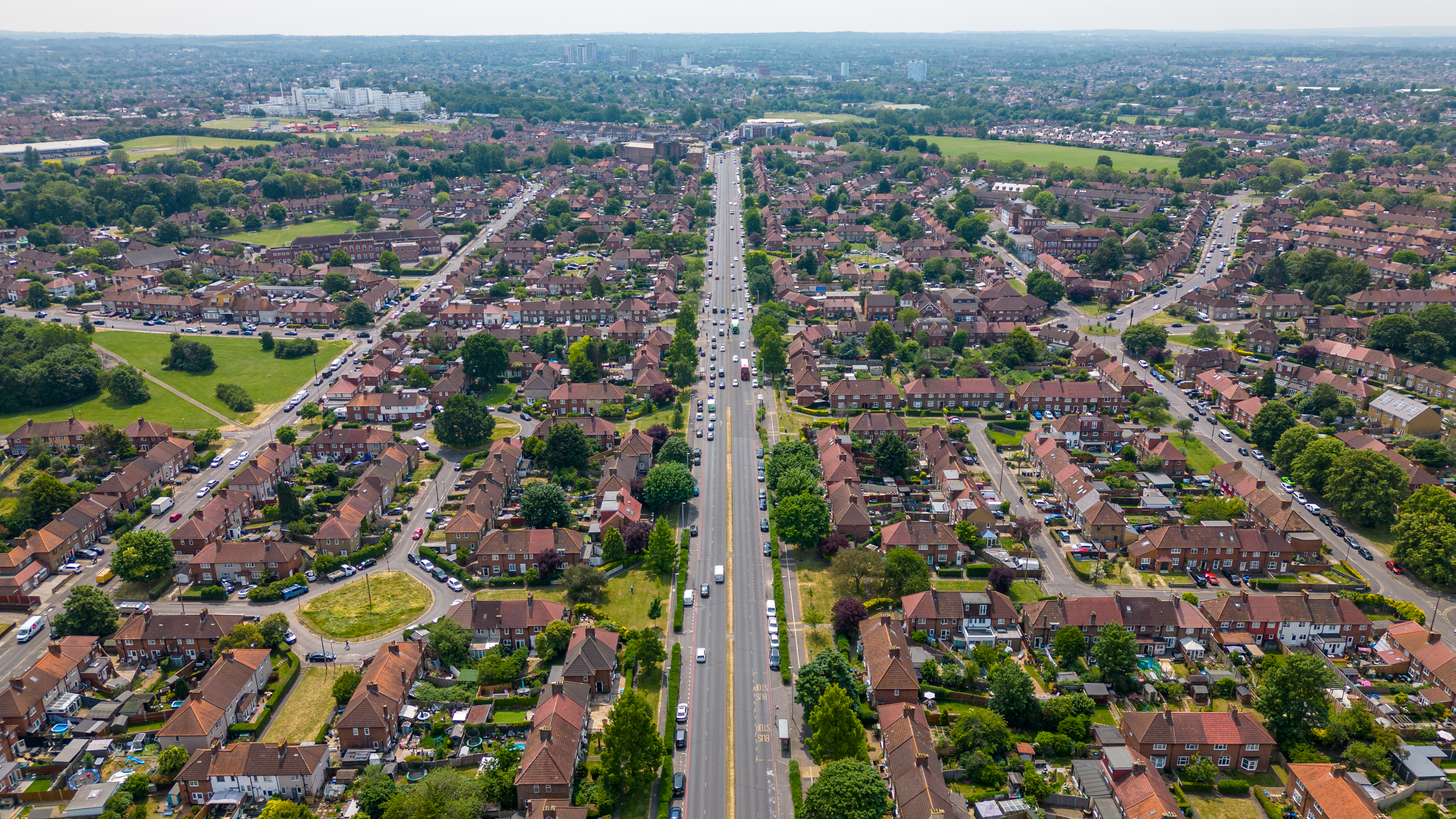 Aerial view of a suburban neighborhood with rows of houses and green trees lining the streets in London.