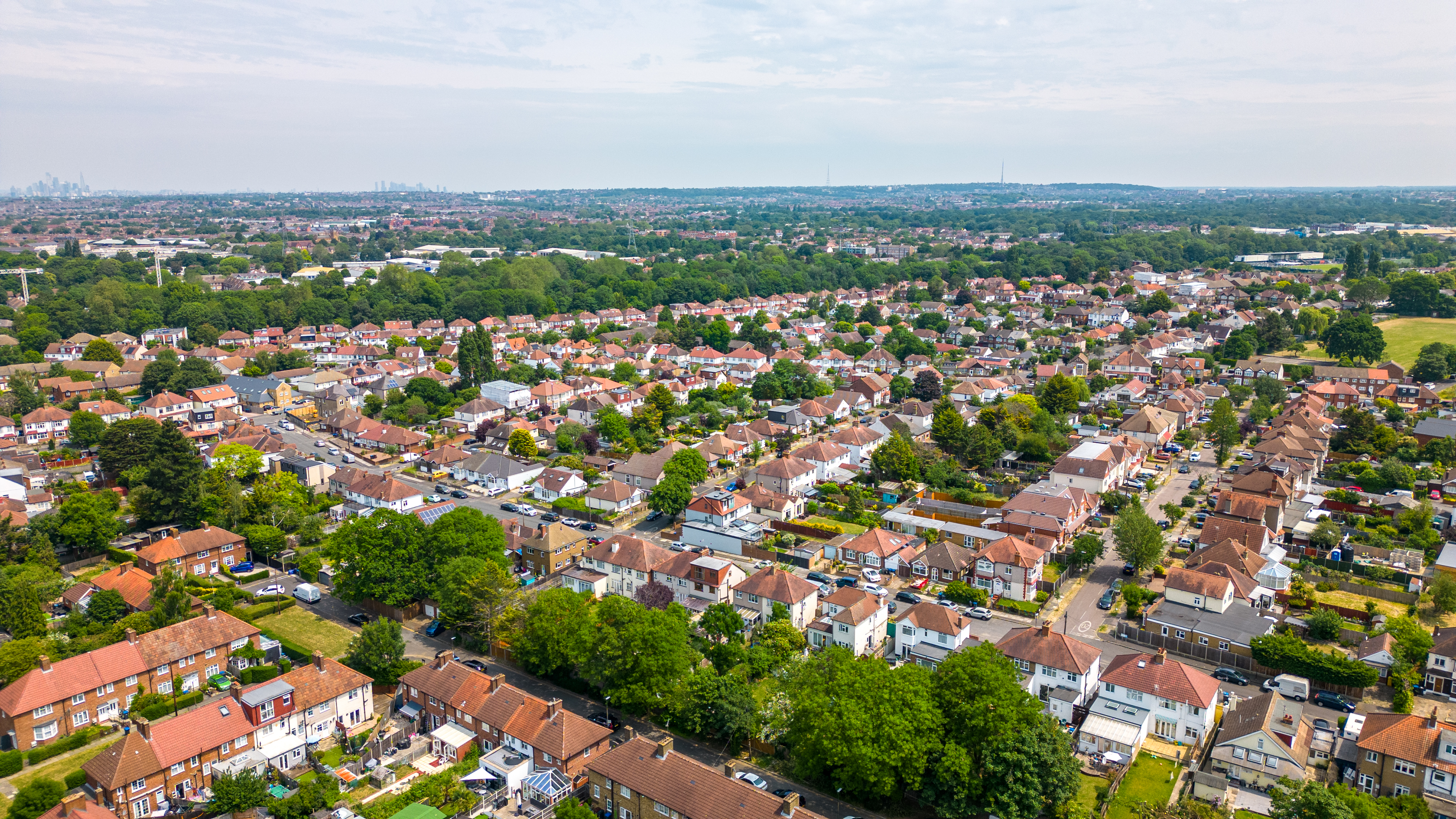 Aerial view of a suburban neighborhood with rows of houses and green trees under a cloudy sky in London.