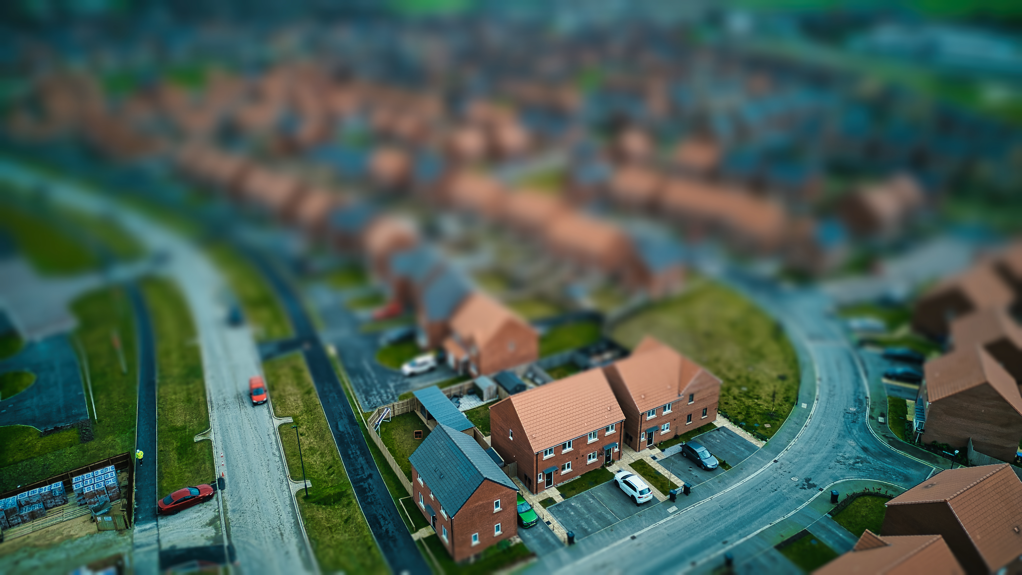 Aerial view of a suburban neighborhood with tilt-shift effect, creating a miniature scene.