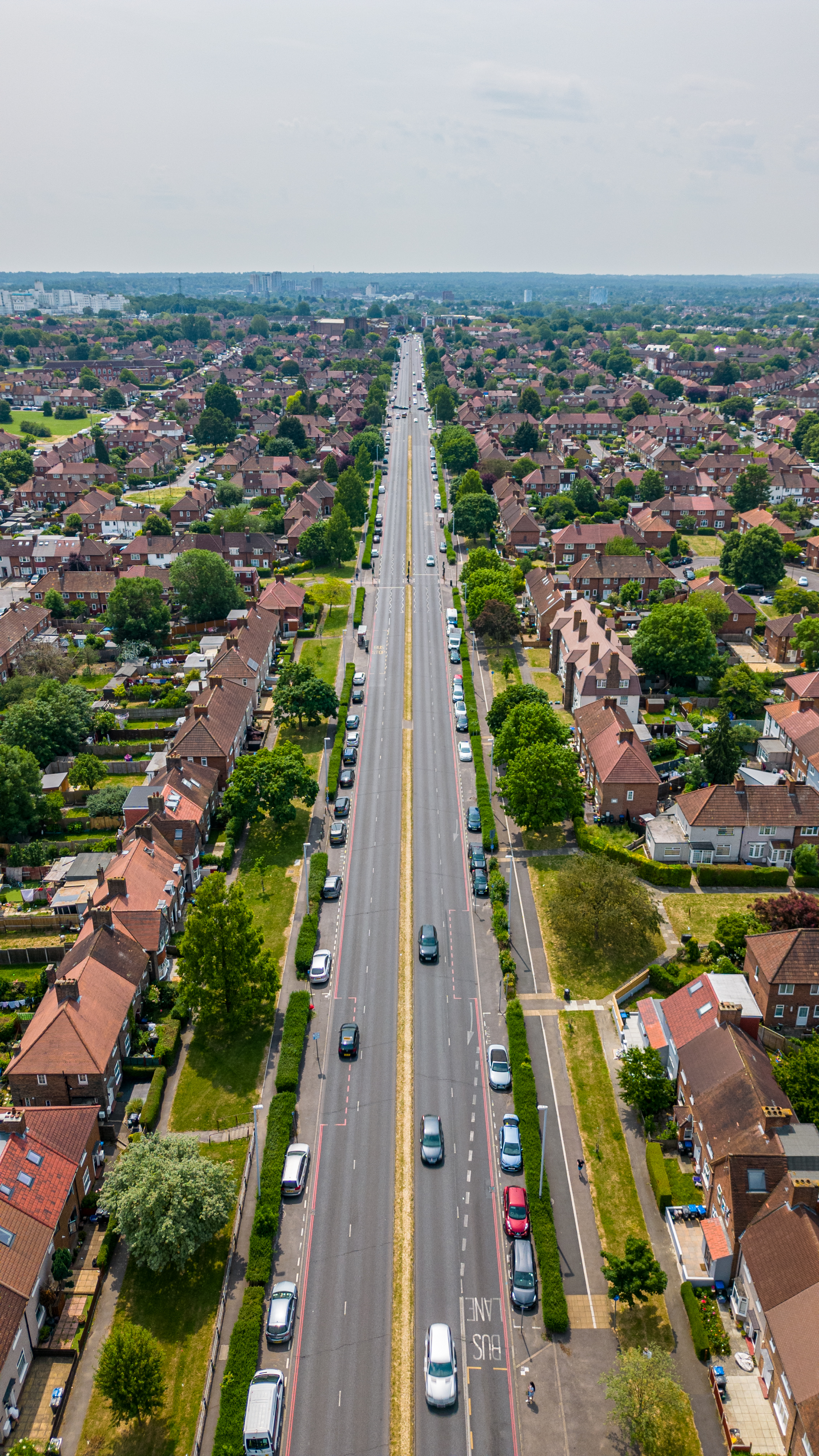 Aerial view of a suburban road with cars, lined with houses, depicting everyday traffic and residential life in London.