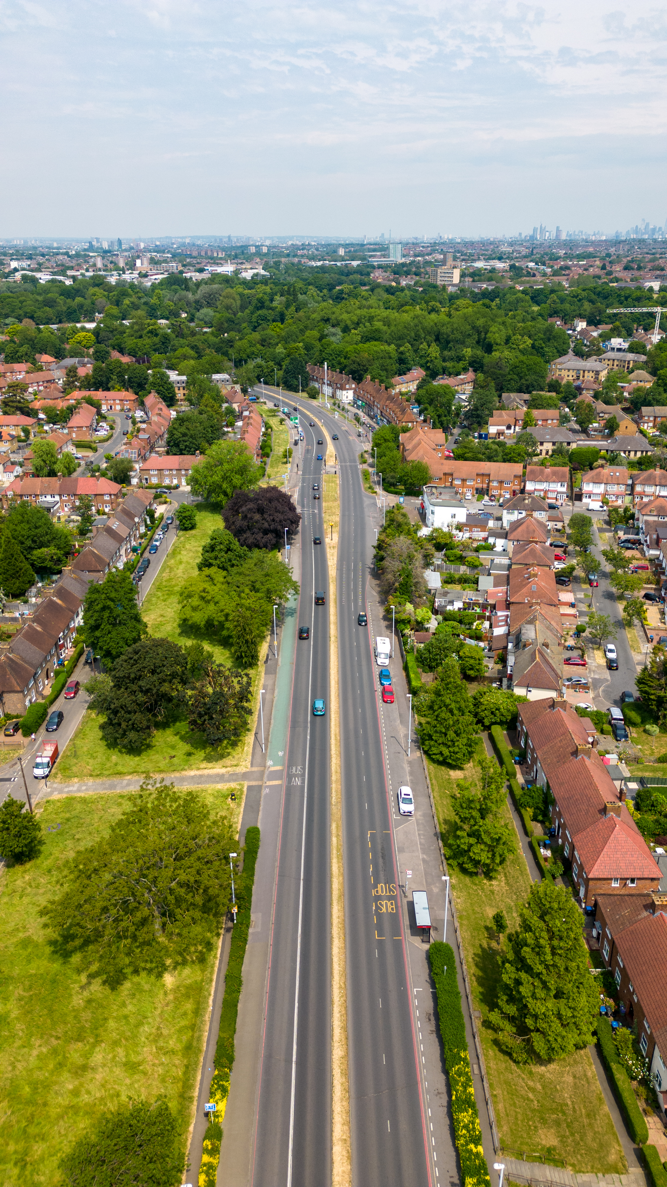 Aerial view of a suburban road with cars, surrounded by greenery and residential houses under a clear sky in London.