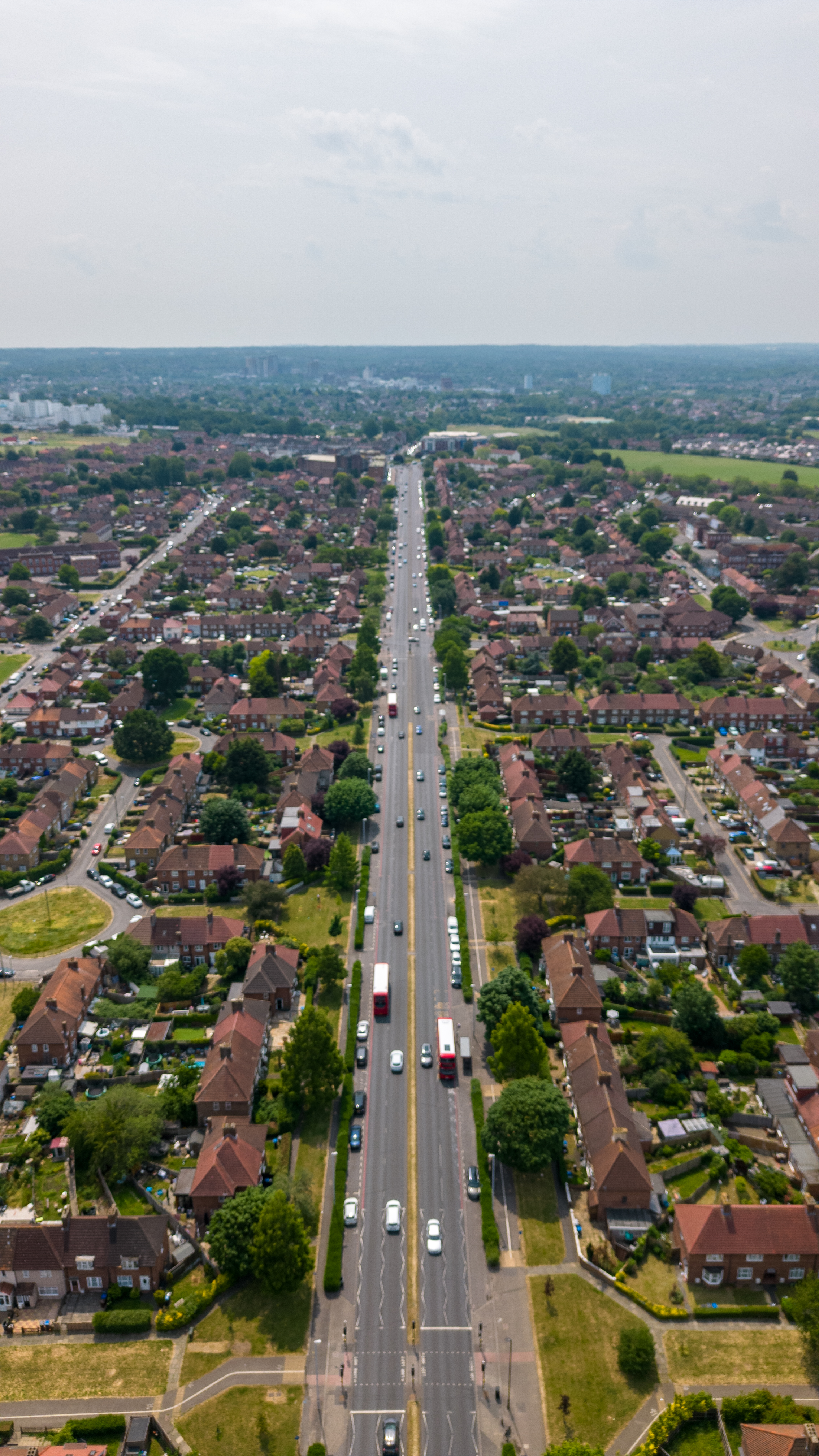 Aerial view of a suburban street with houses and greenery, showcasing a residential area from above in London.