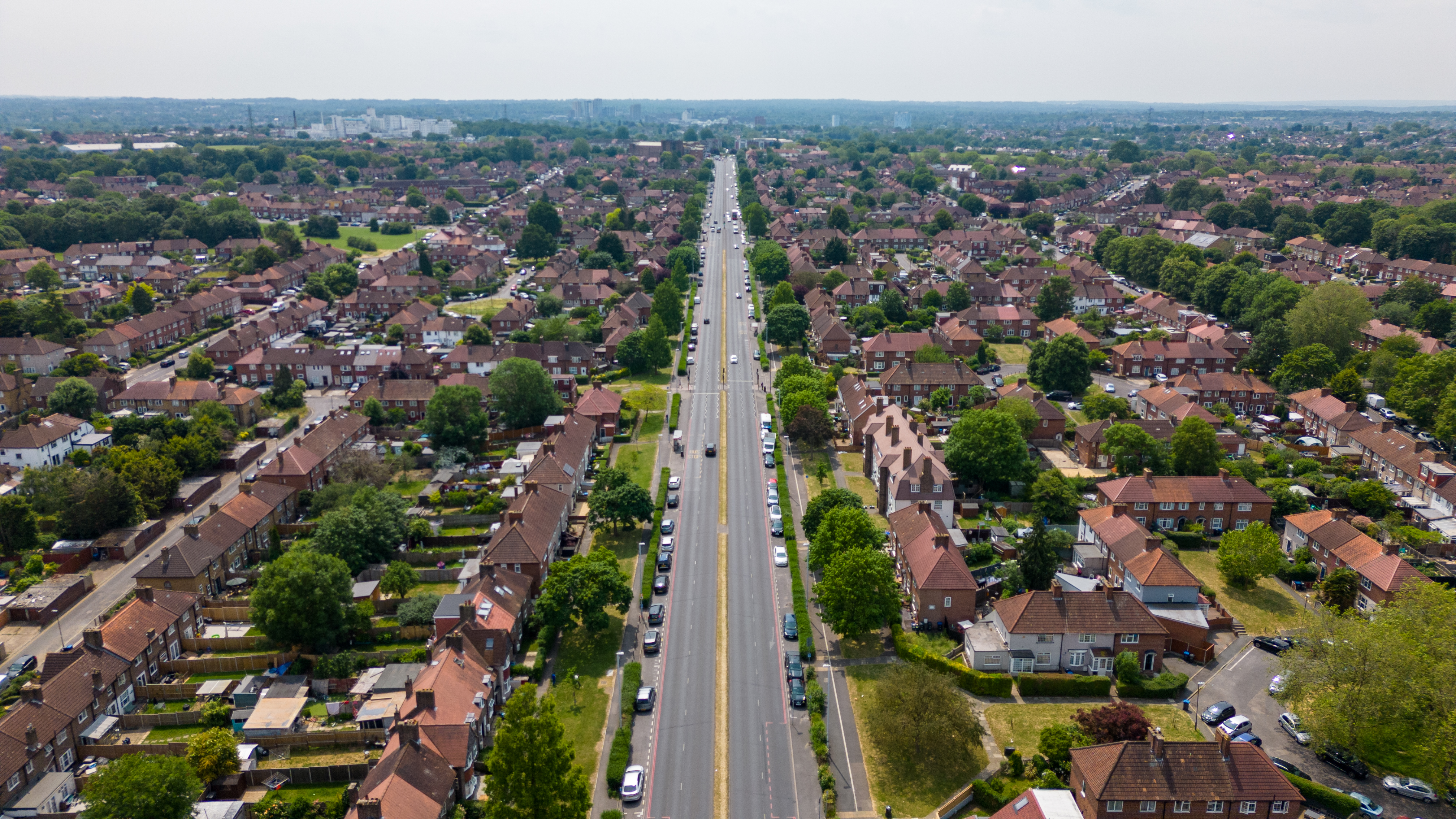 Aerial view of a suburban street with rows of houses, green trees, and a clear road stretching into the distance under a blue sky in London.