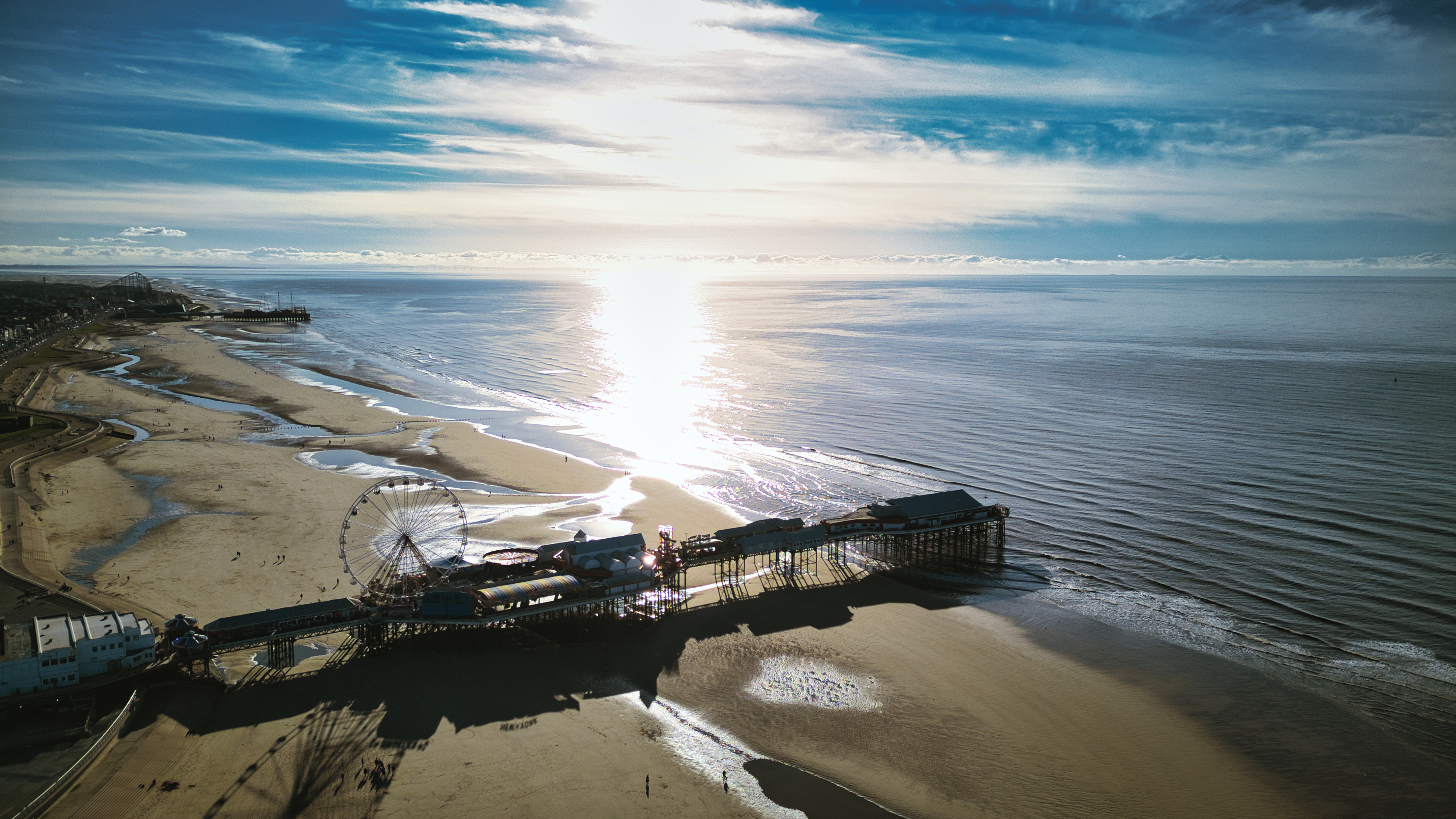 Aerial view of a sunlit beach with a pier extending into calm waters, casting shadows on the sand in Backpool, England.