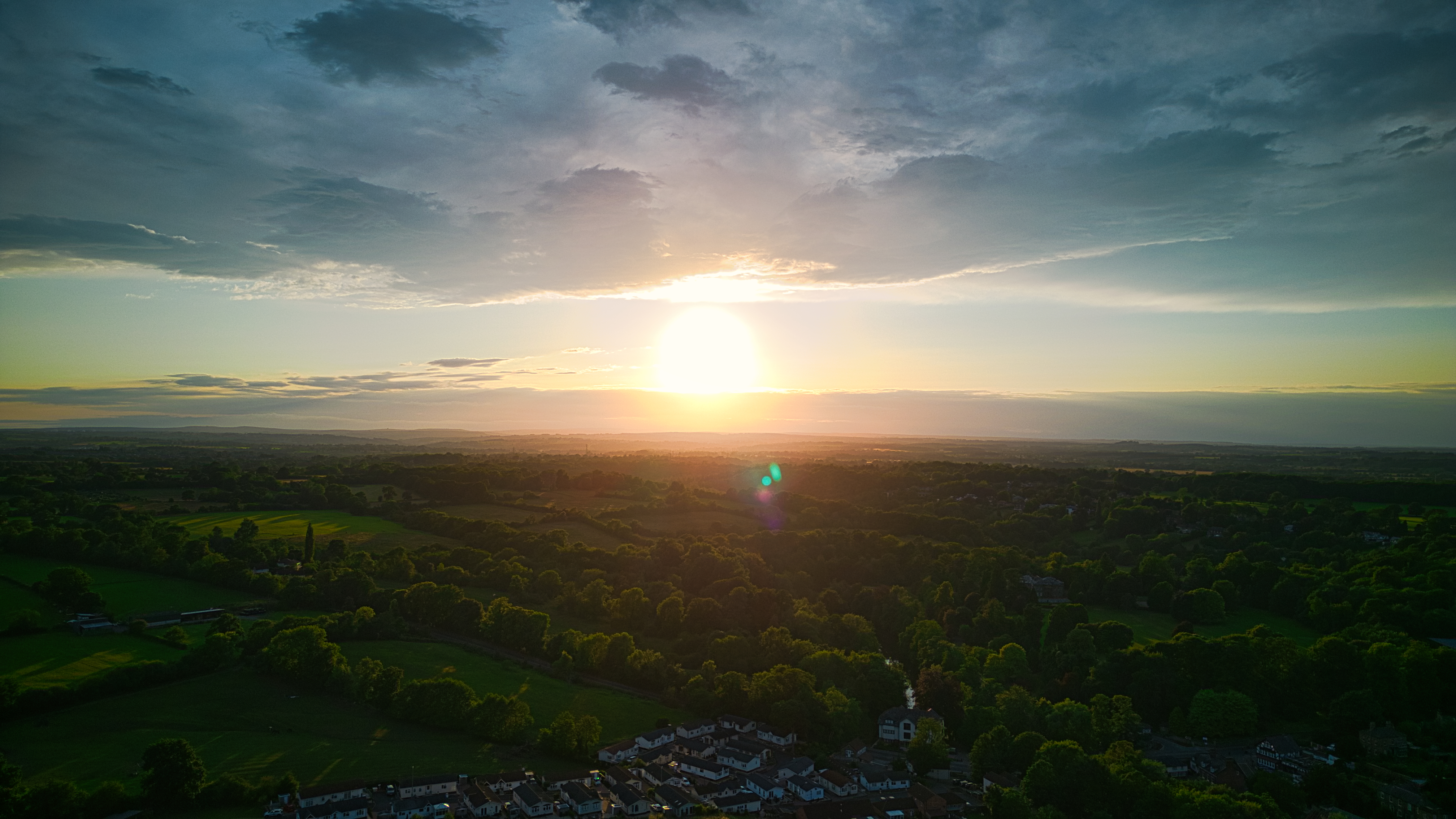 Aerial view of a sunset over a lush landscape with scattered clouds, casting a warm glow over the horizon Aerial view of a historic town with an ancient tower, surrounded by lush green trees under a clear blue sky in Knaresborough, North Yorkshire.