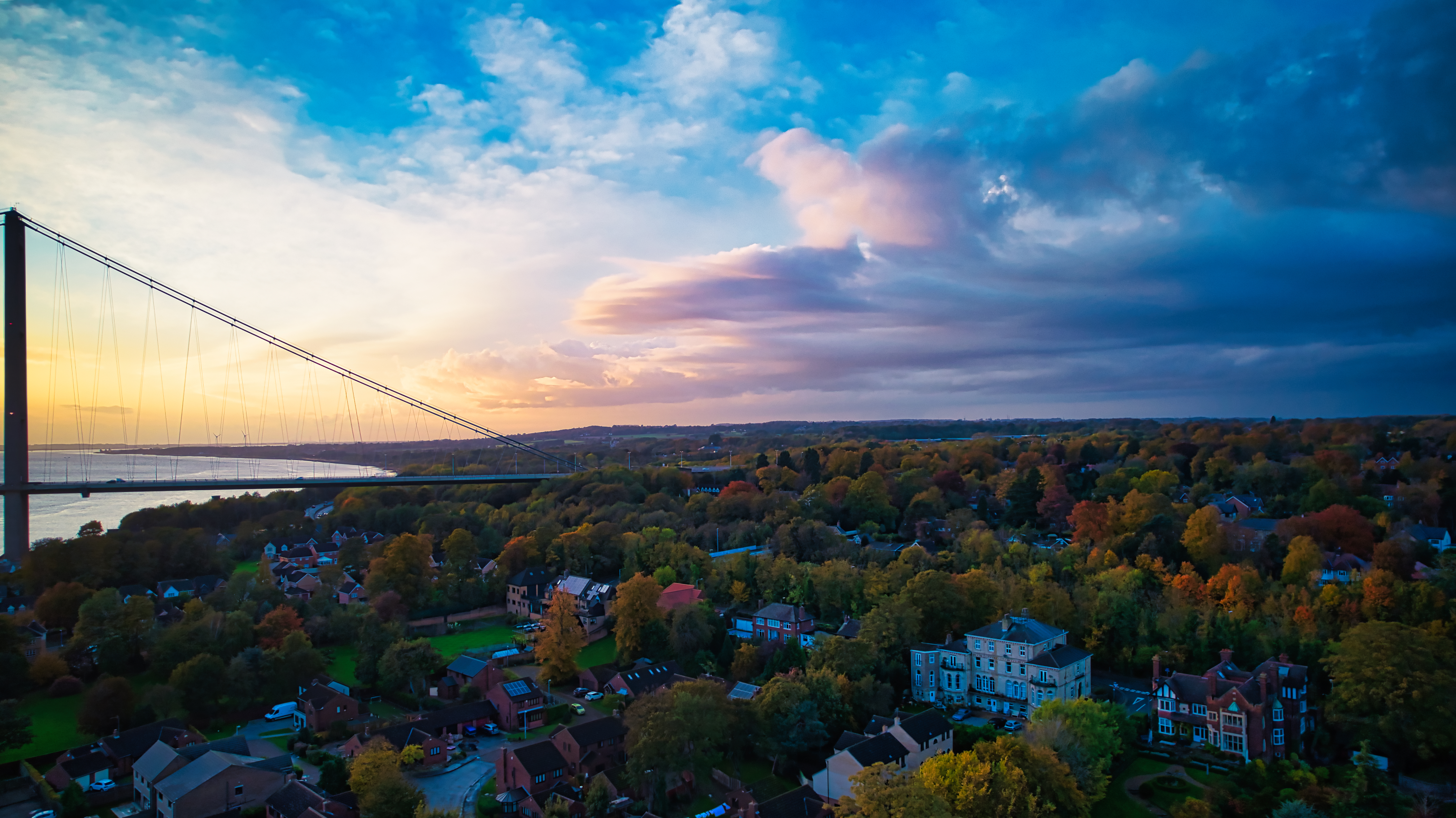 Aerial view of a suspension bridge over a river at sunset with colorful autumn foliage in Hull, England.