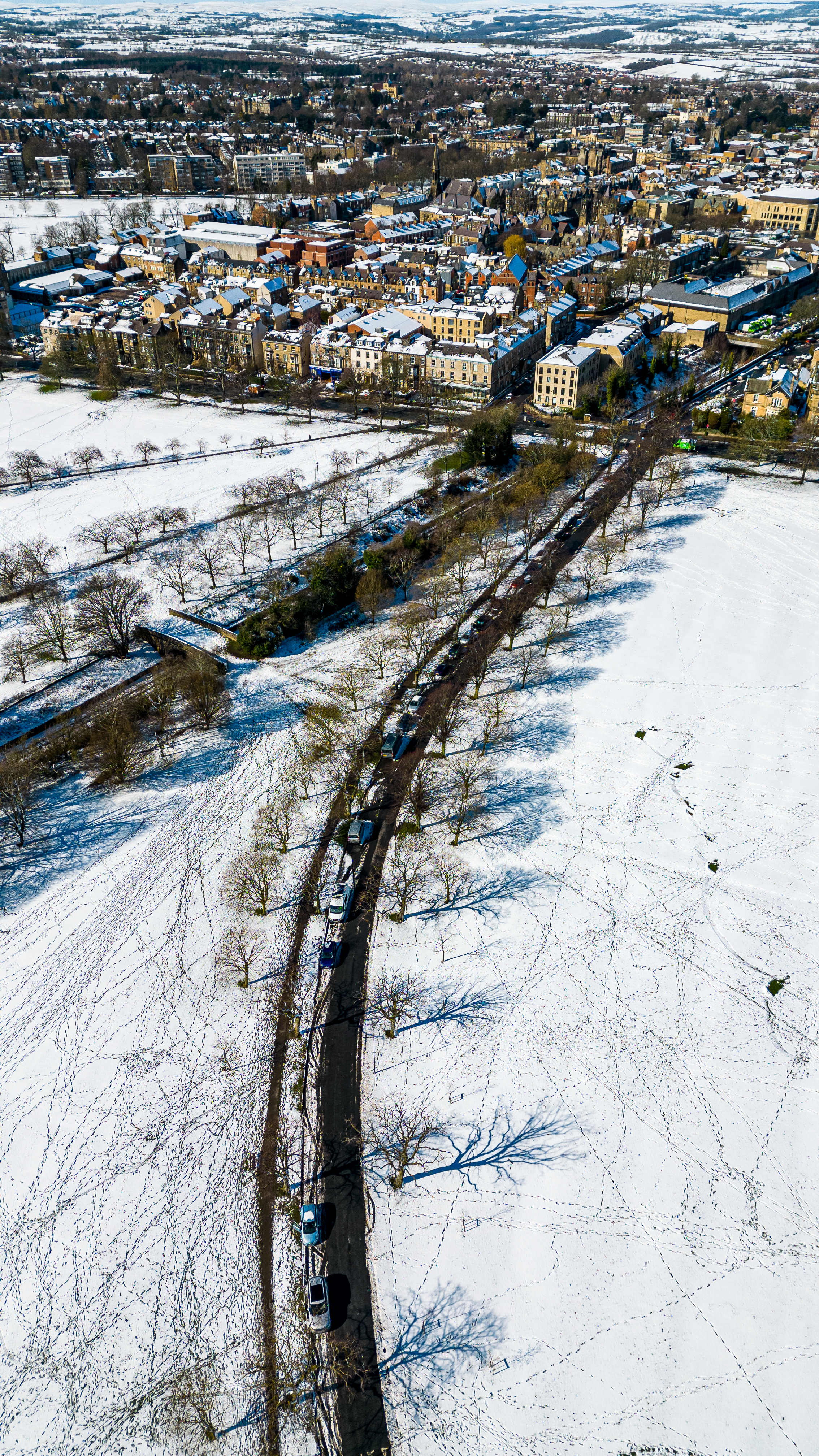 Aerial view of a train passing through a snowy landscape with a town in the background in Harrogate, North Yorkshire.