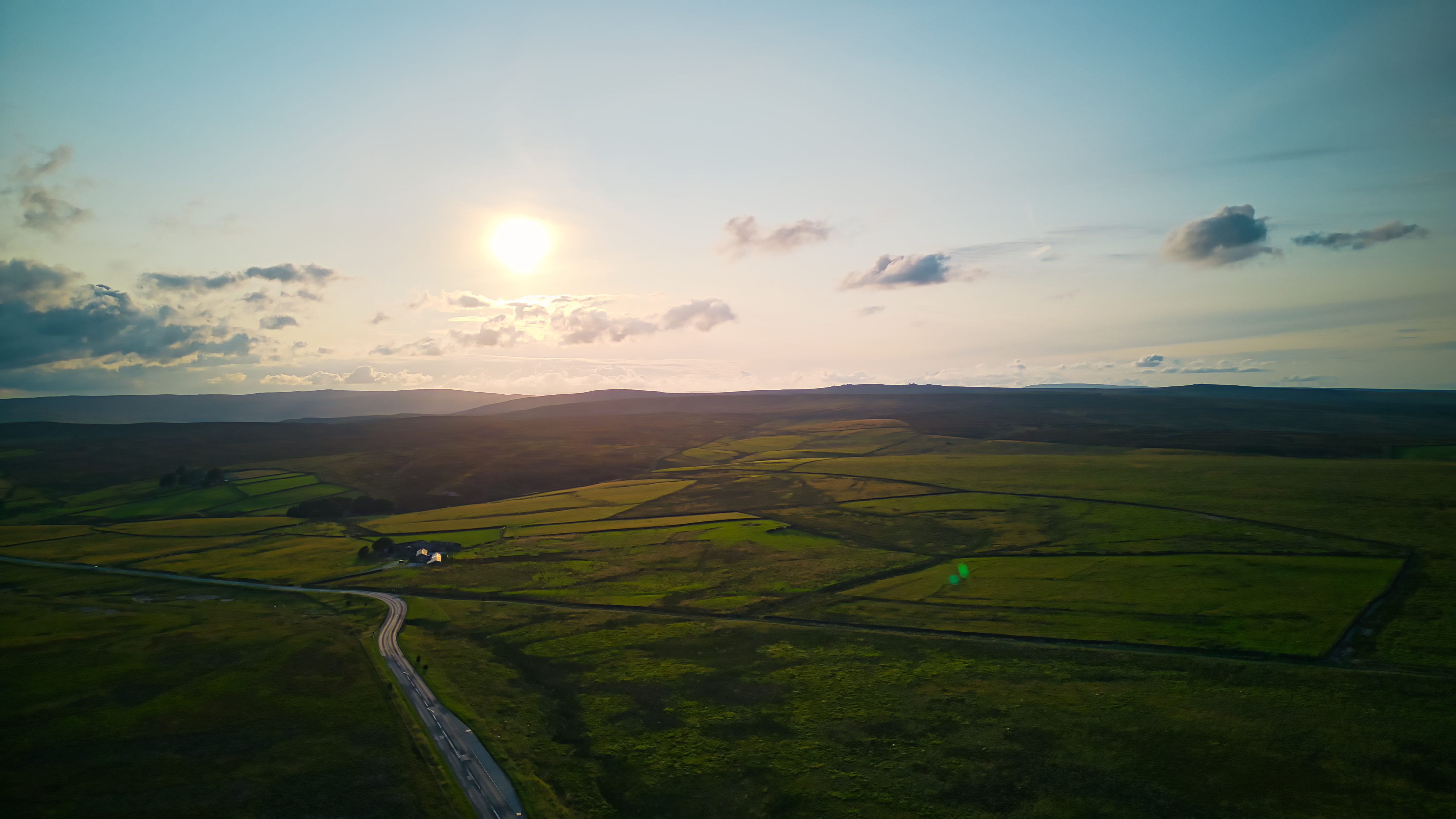 Aerial view of a tranquil countryside at sunset with a winding road leading to a solitary house amidst green fields in Yorkshire.
