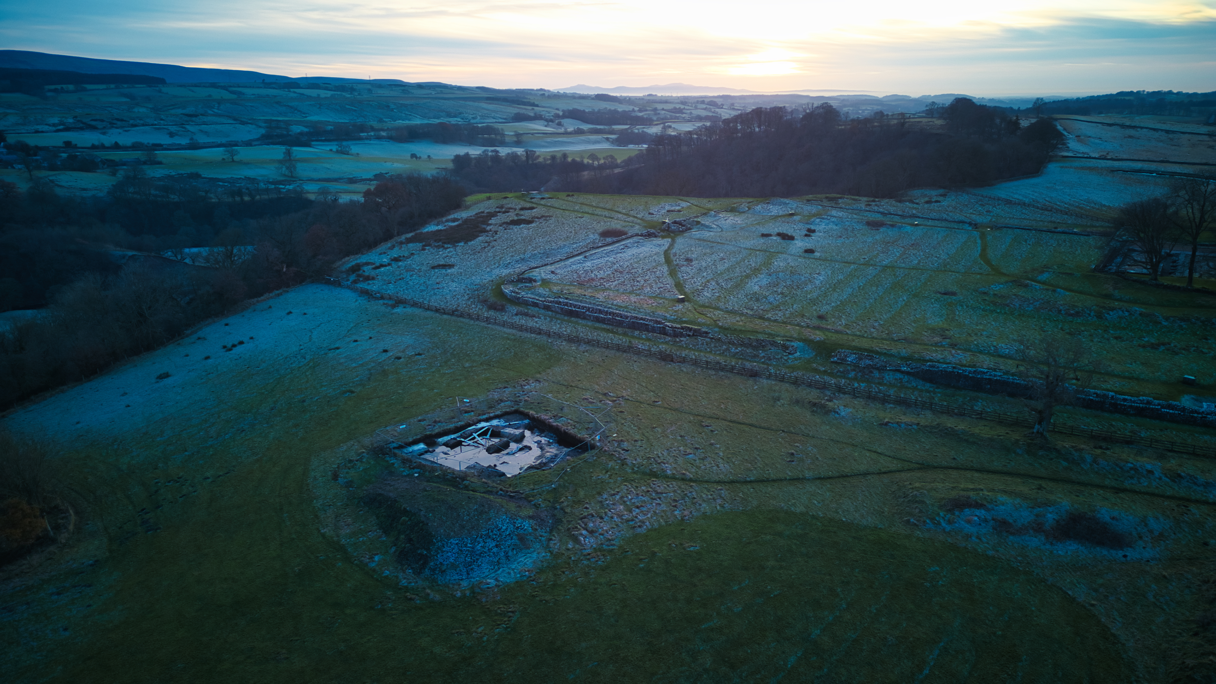 Aerial view of a tranquil countryside landscape at dusk with fields, a pond, and the horizon under a gradient sky.