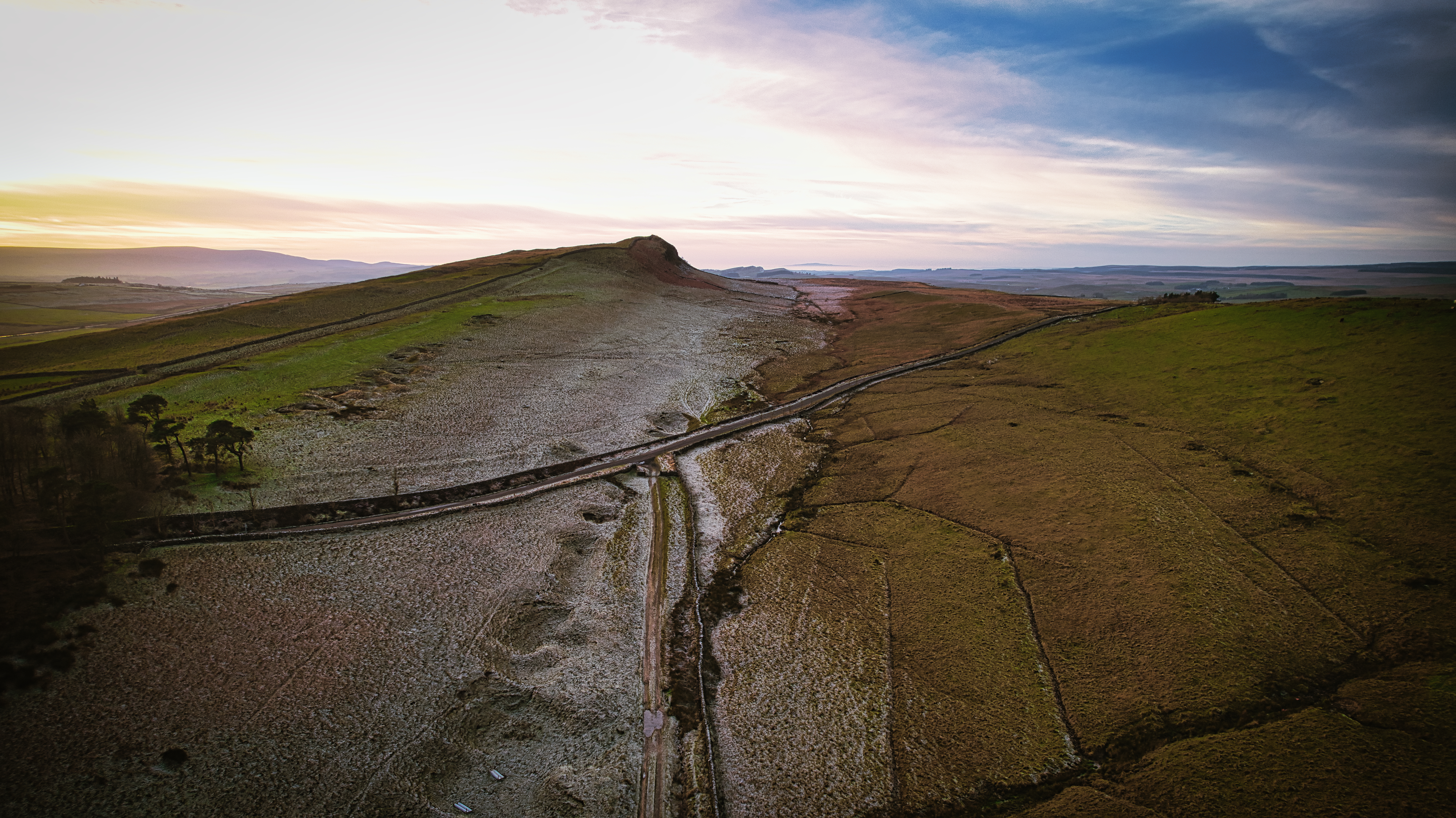 Aerial view of a tranquil countryside landscape at dusk with rolling hills and a winding path at Sycamore Gap, Northumberland, UK.