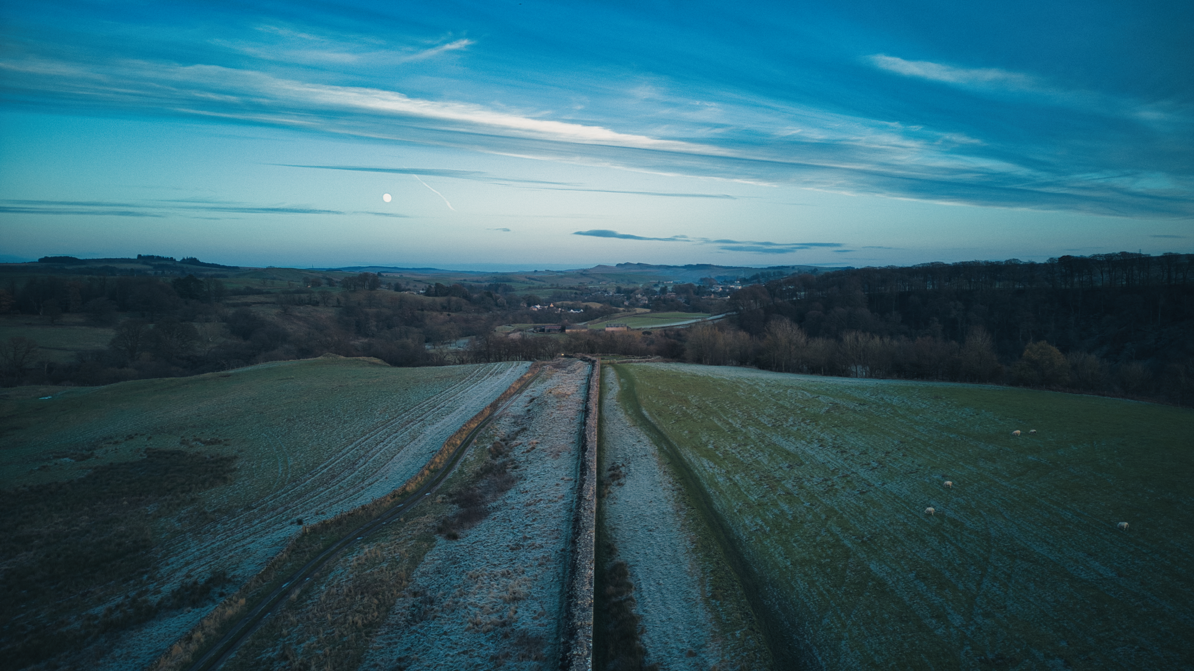 Aerial view of a tranquil countryside road at dusk with soft lighting and a serene sky.