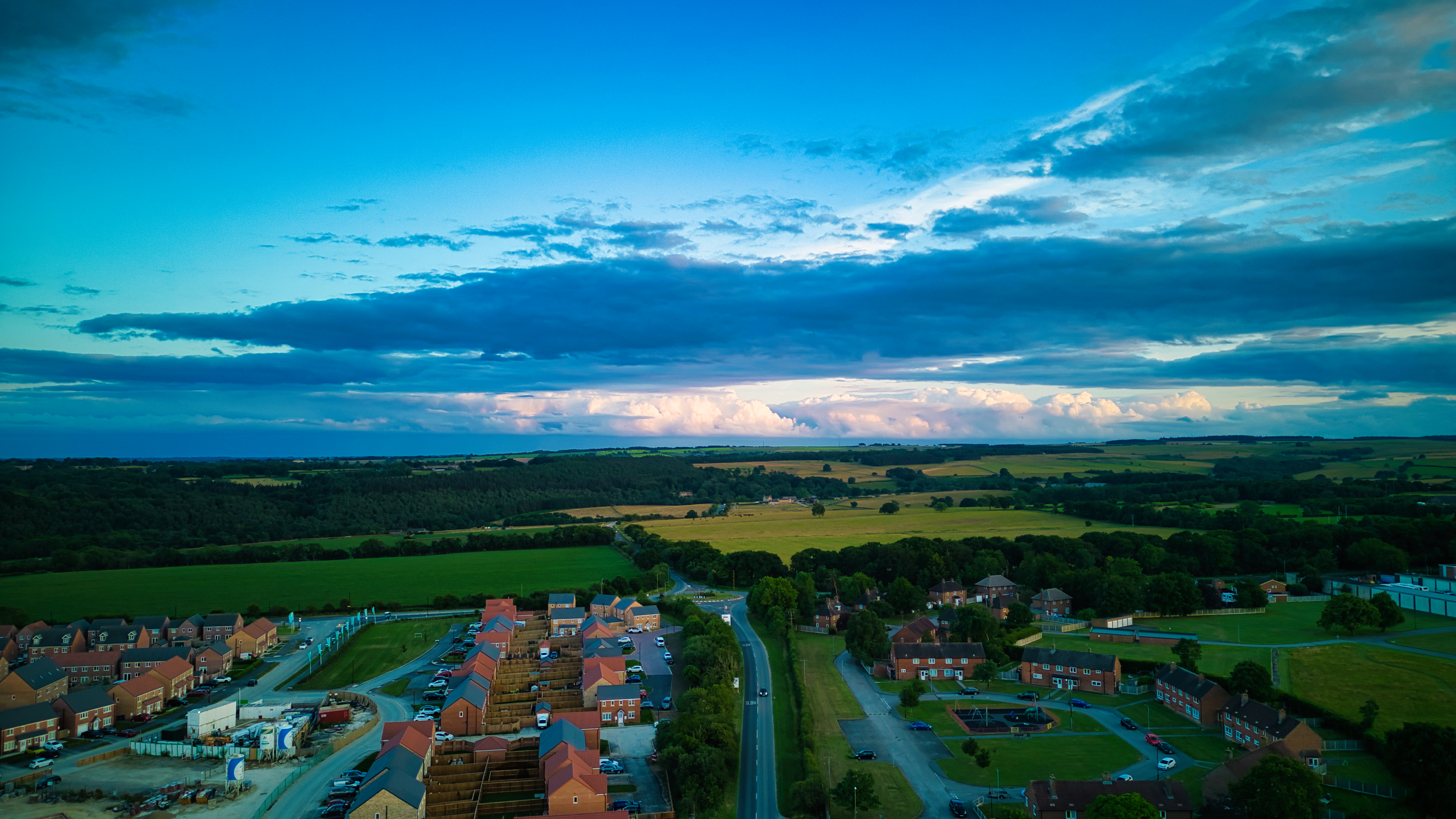 Aerial view of a tranquil town at dusk with vibrant blue skies and scattered clouds over a picturesque landscape.