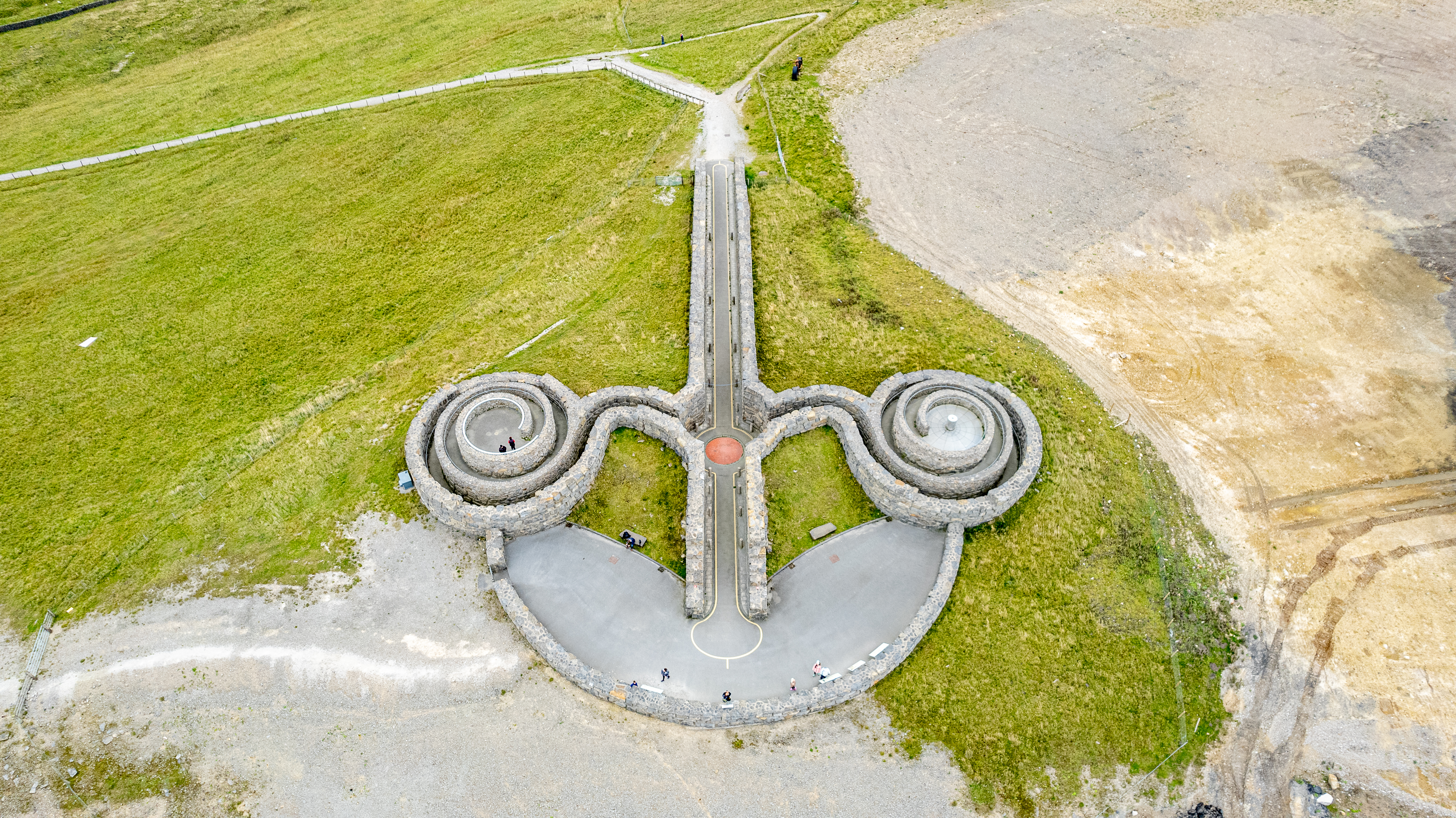 Aerial view of a unique spiral sculpture on a grassy landscape with a pathway leading to it.
