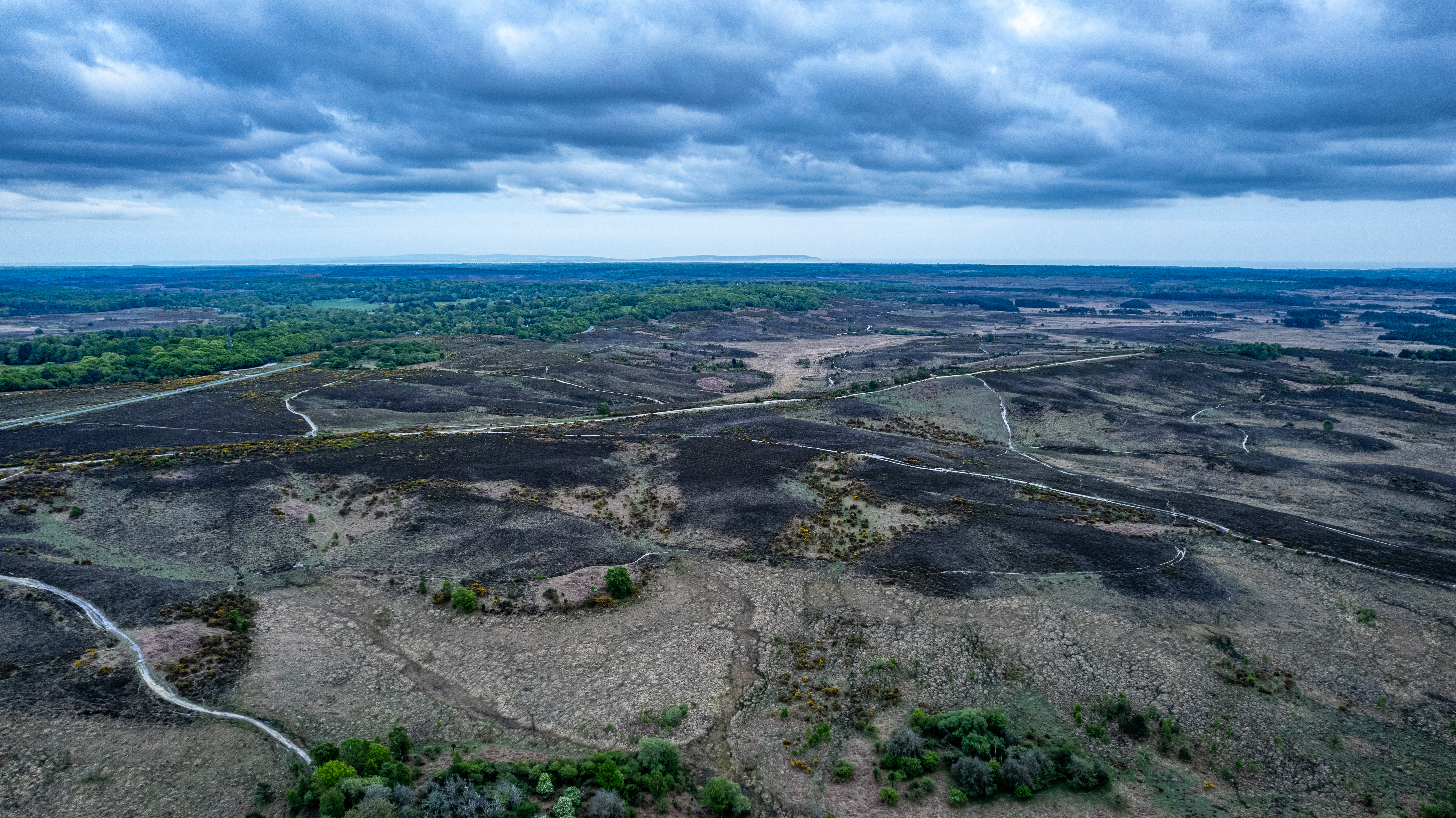 Aerial view of a vast, barren landscape with scattered vegetation under a cloudy sky.