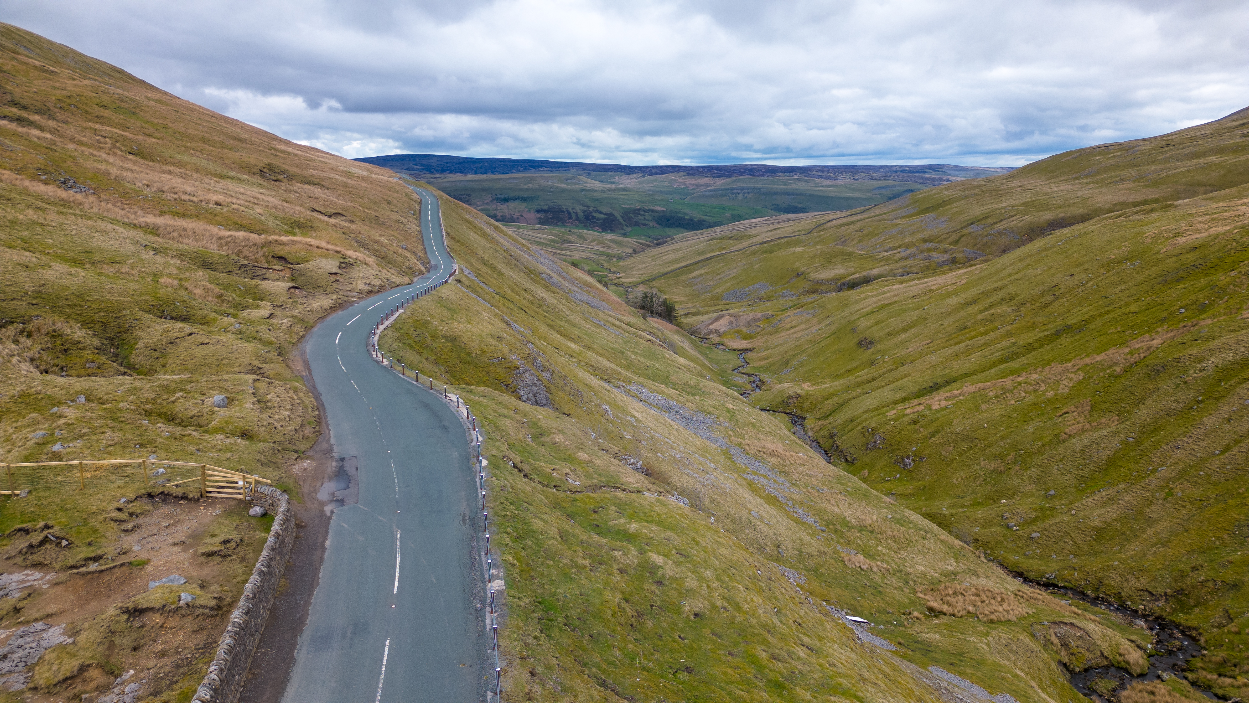 Aerial view of a vast, undulating landscape with green hills, a winding road, and overcast skies.