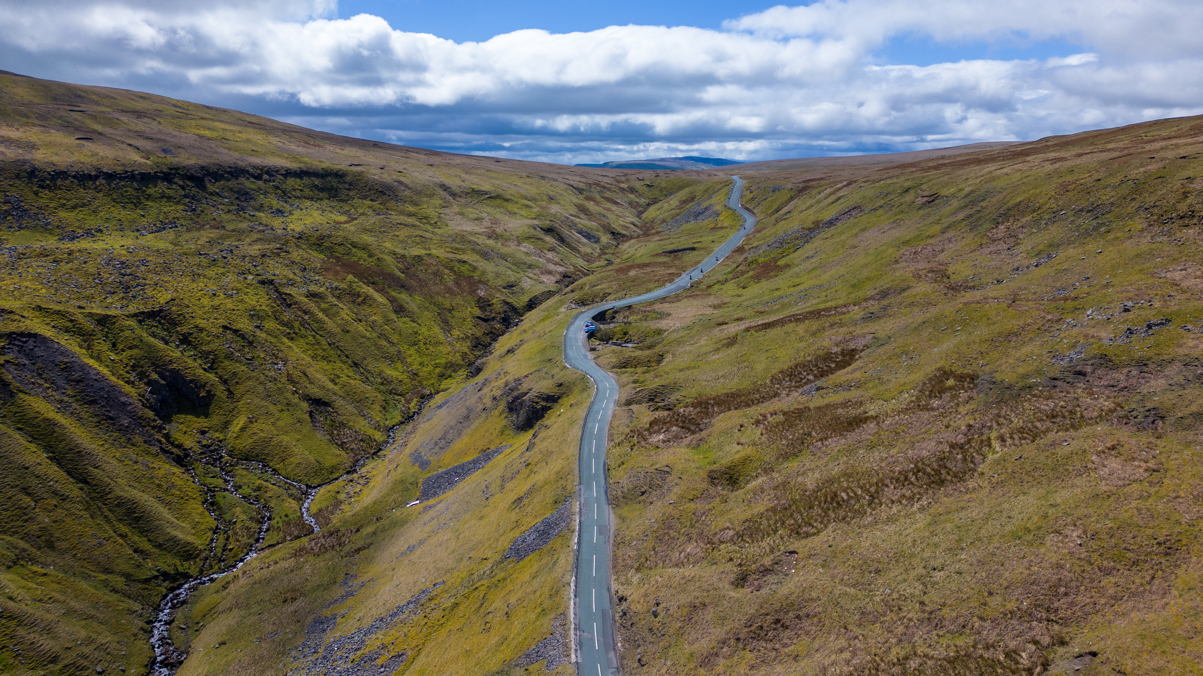 Aerial view of a vast, undulating landscape with green hills, a winding road, and overcast skies.