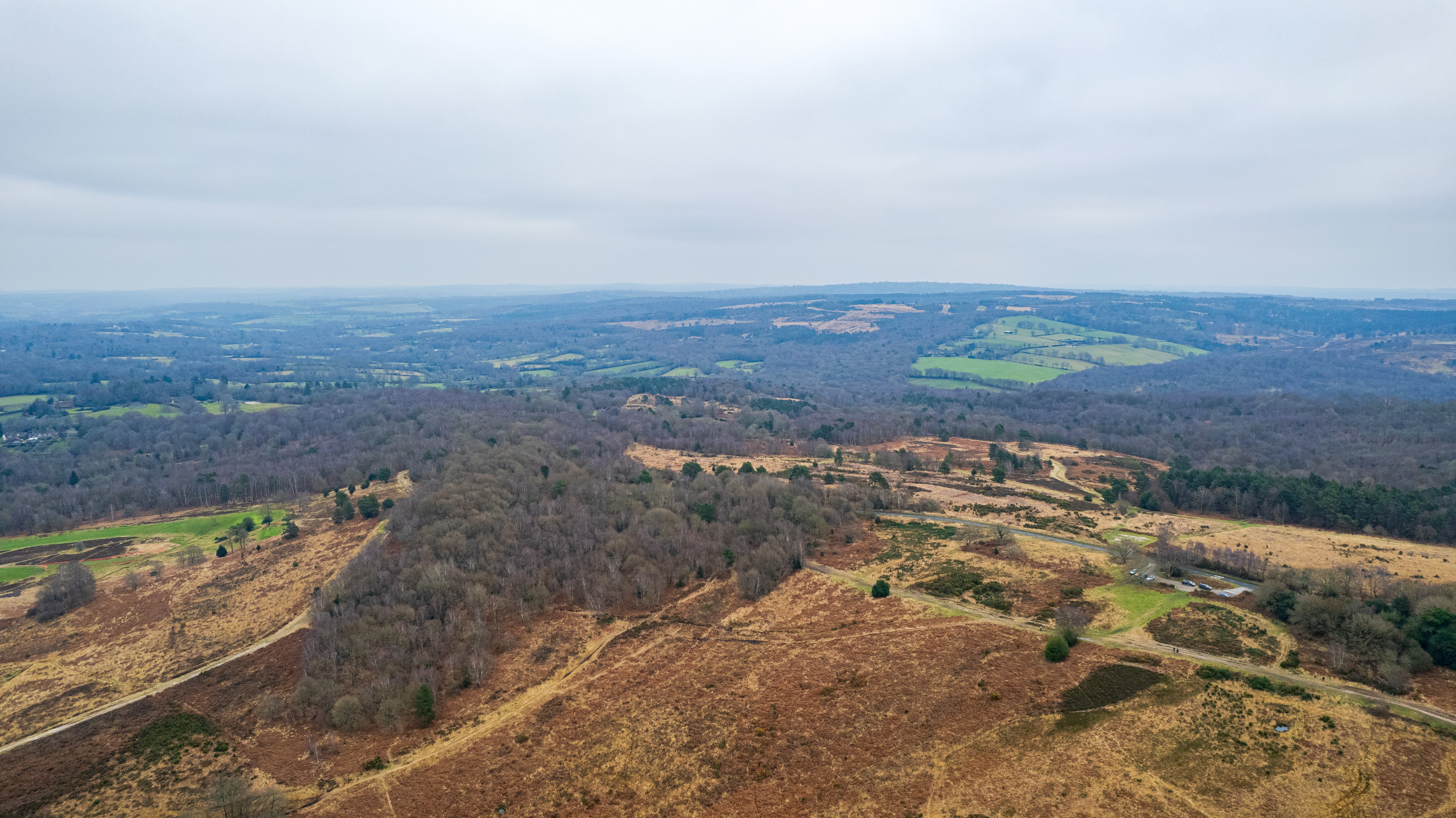 Aerial view of a vast, undulating landscape with patches of greenery and barren land under a cloudy sky.