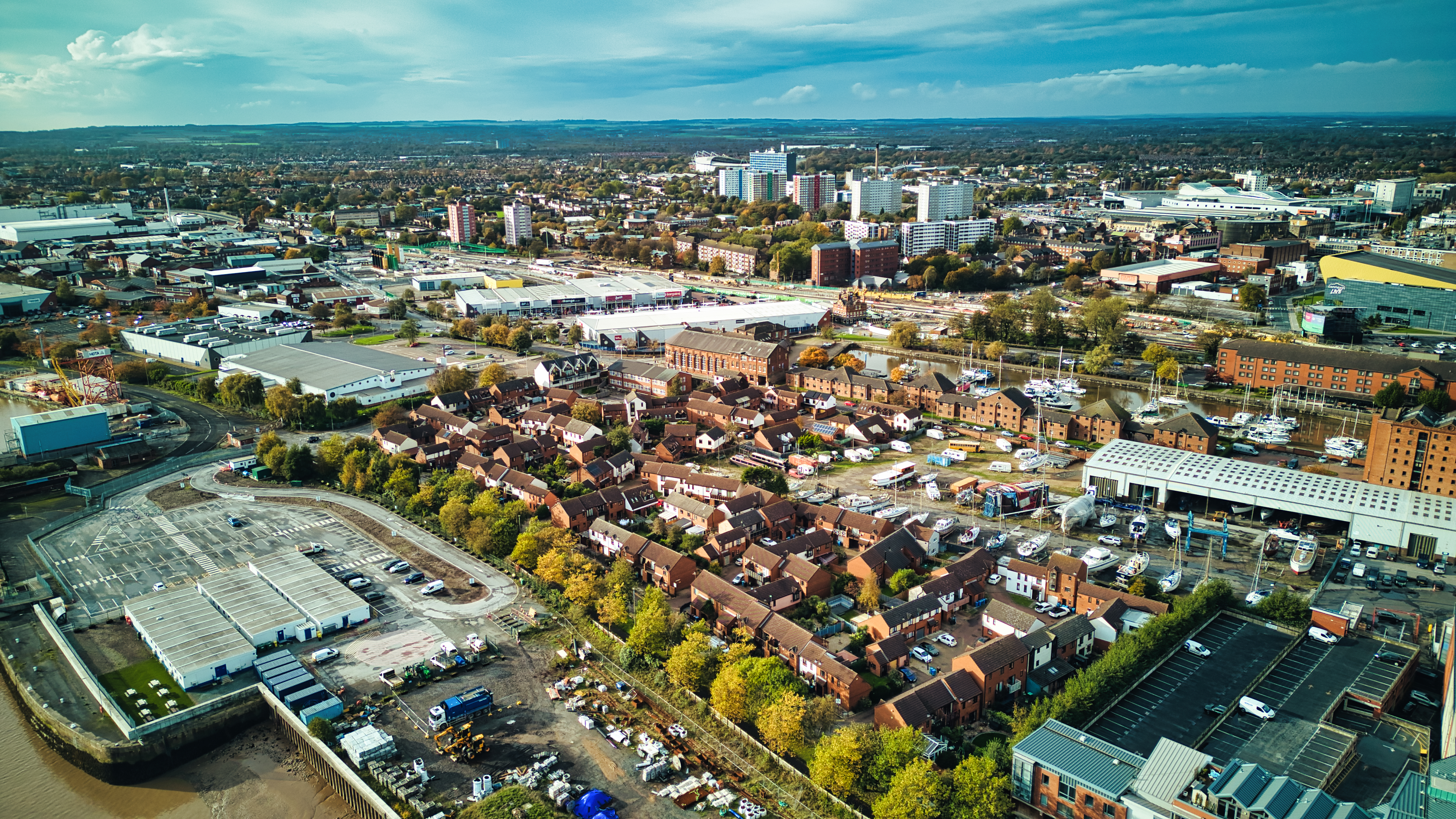 Aerial view of a vibrant cityscape with a mix of residential and commercial buildings under a clear blue sky with scattered clouds in Hull, England.