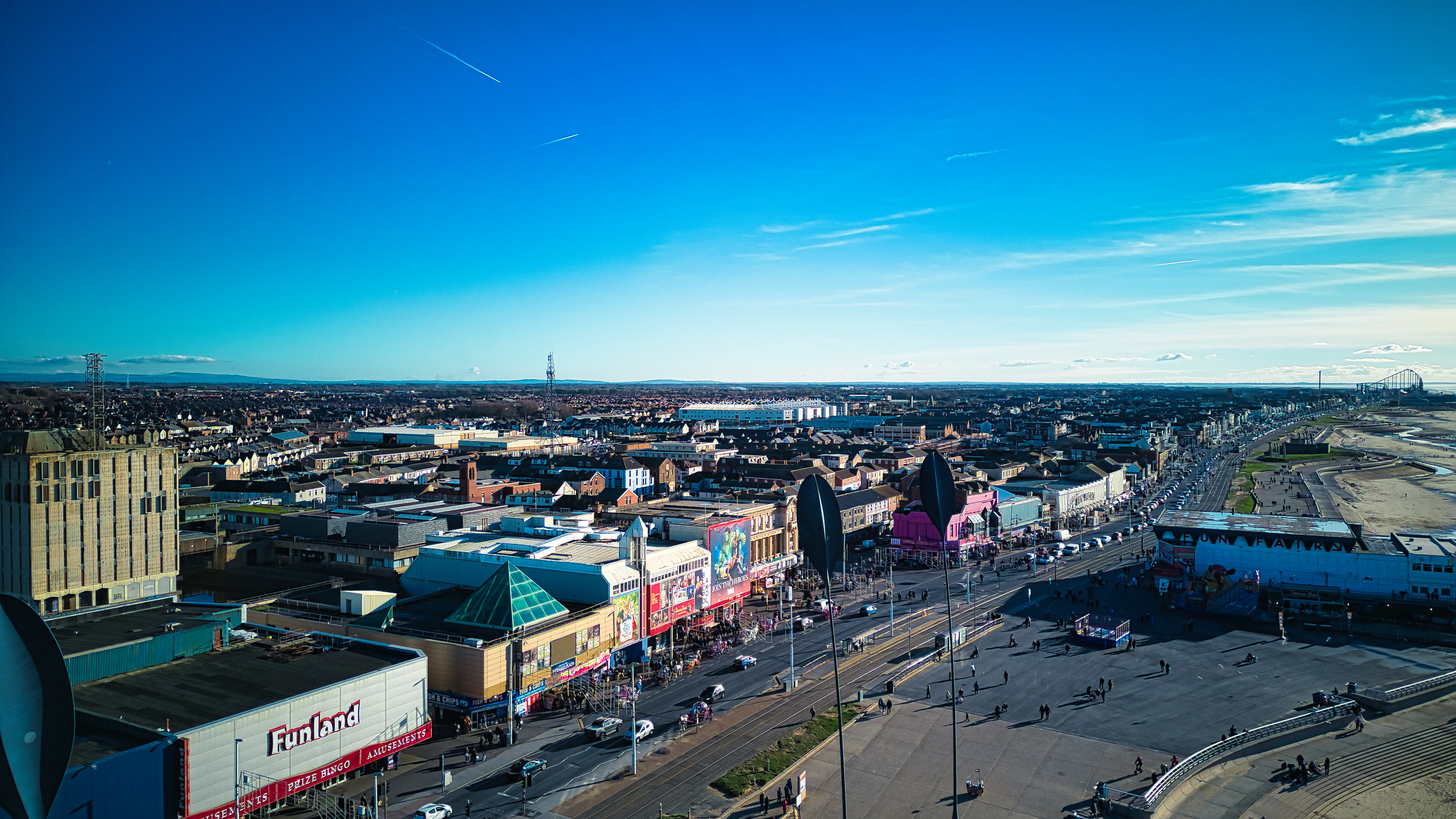Aerial view of a vibrant cityscape with clear blue skies, showcasing urban architecture and busy streets in Backpool, England.