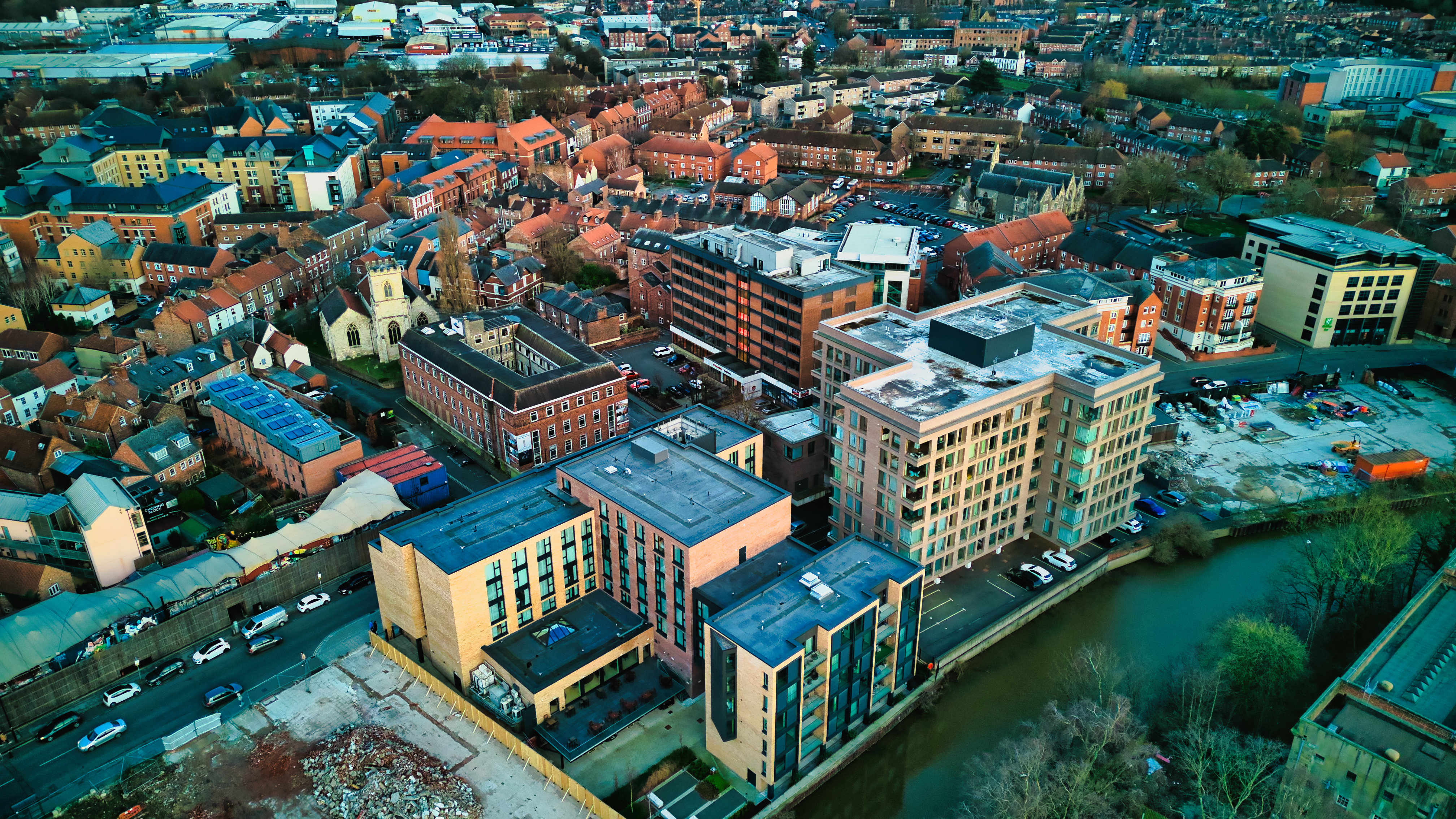 Aerial view of a vibrant urban landscape at dusk with buildings and a river in York, North Yorkshire