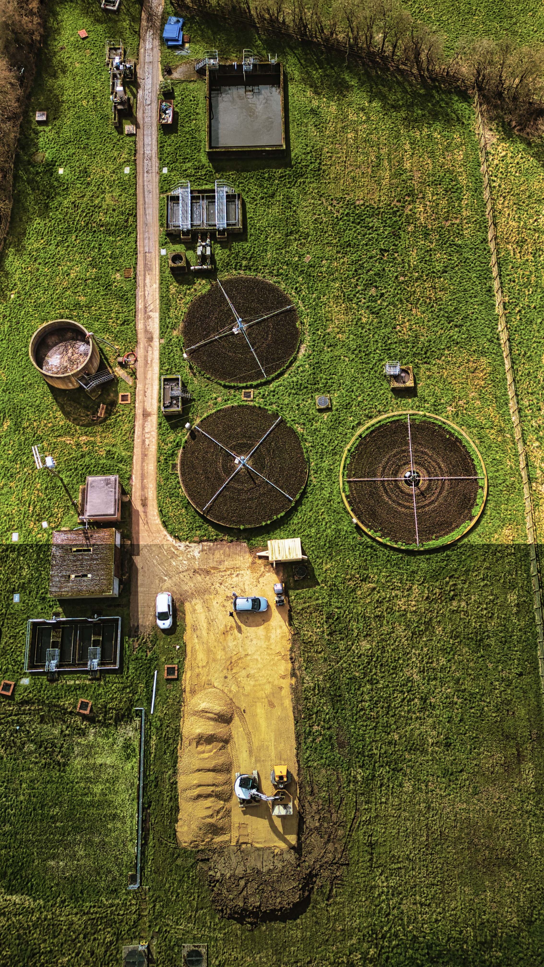 Aerial view of a wastewater treatment facility with circular tanks amidst green fields in North Yorkshire.