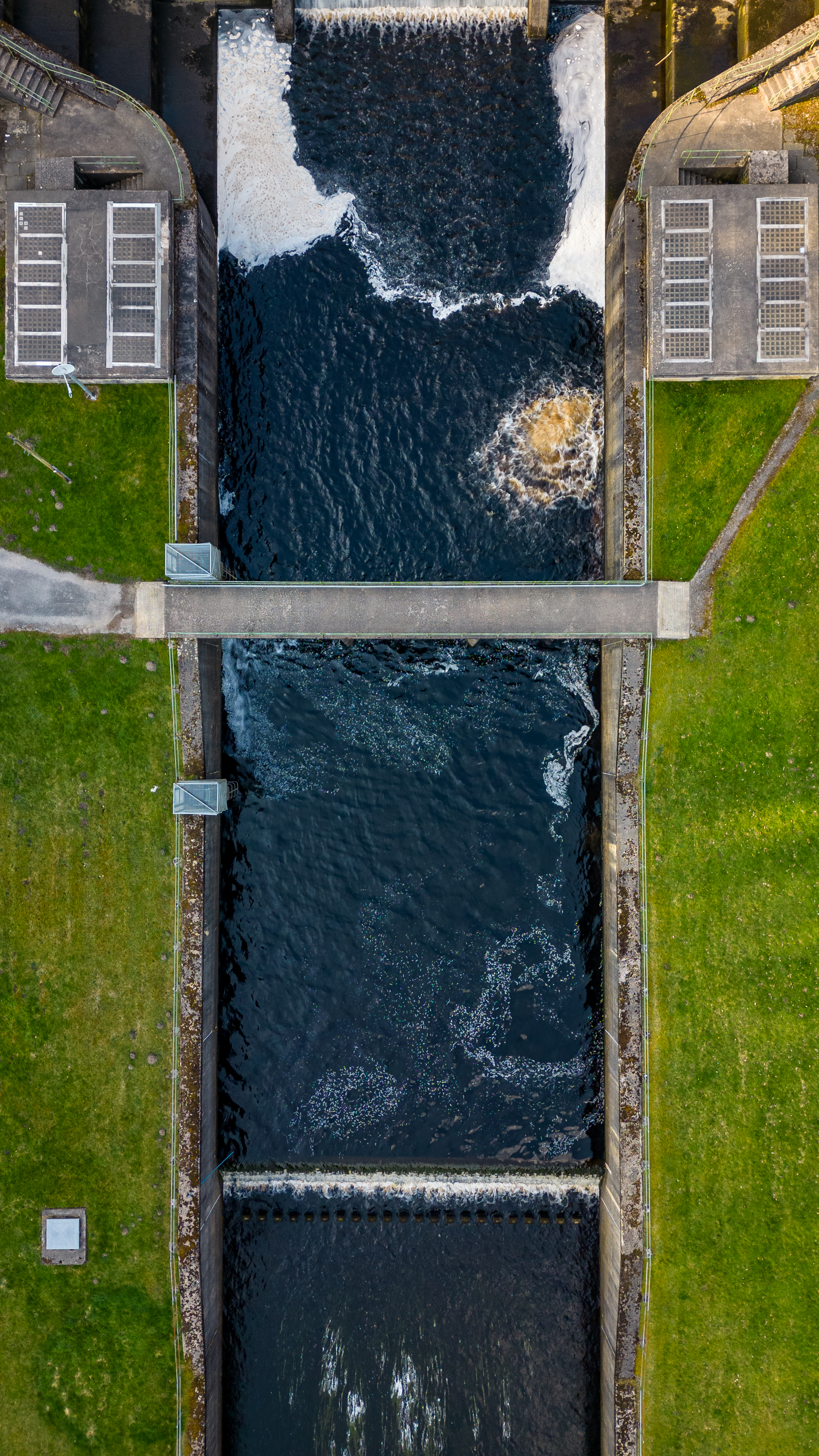 Aerial view of a water canal with flowing water and adjacent pathways.