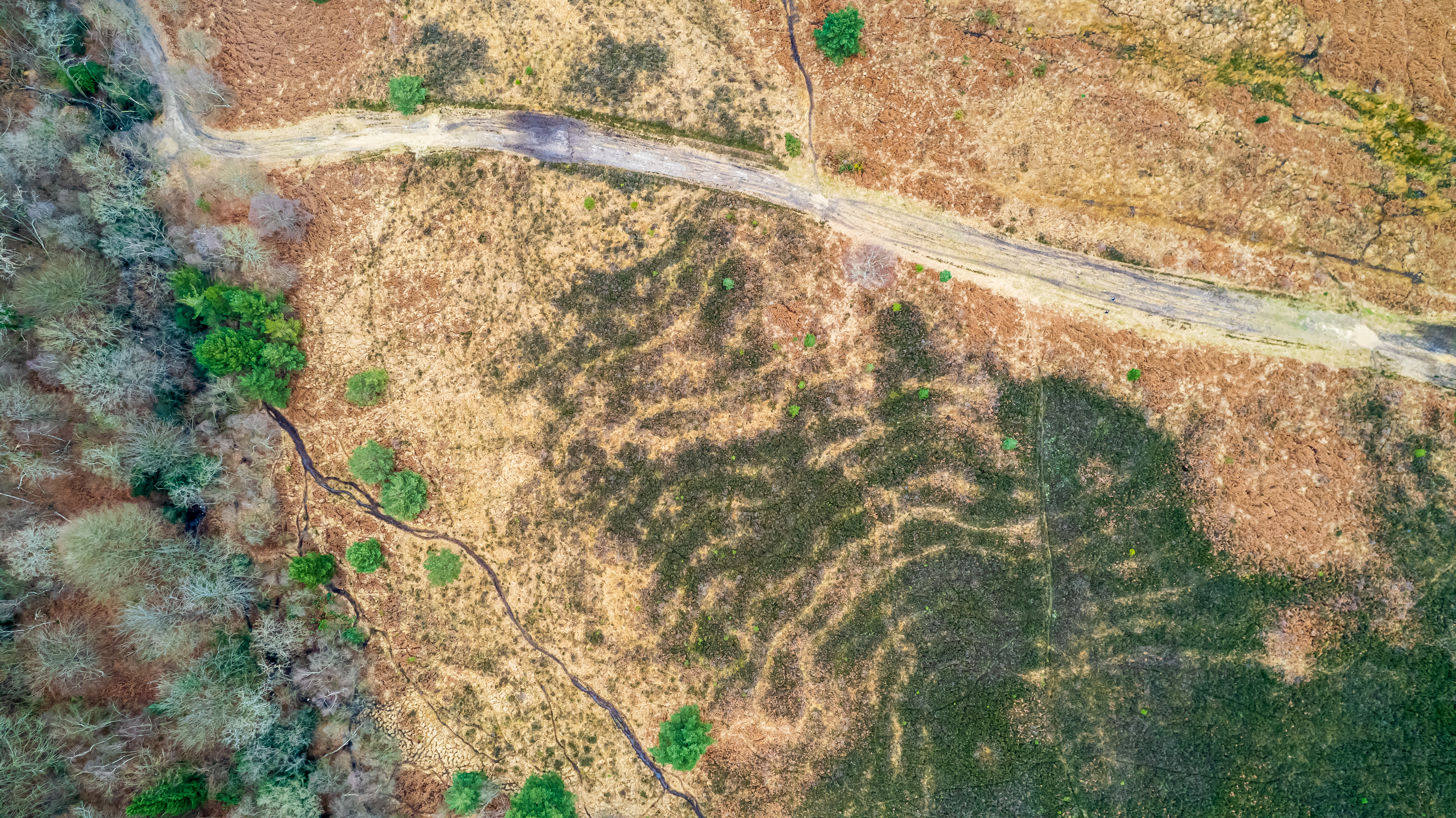Aerial view of a winding dirt road through a dry, rugged landscape with sparse greenery.