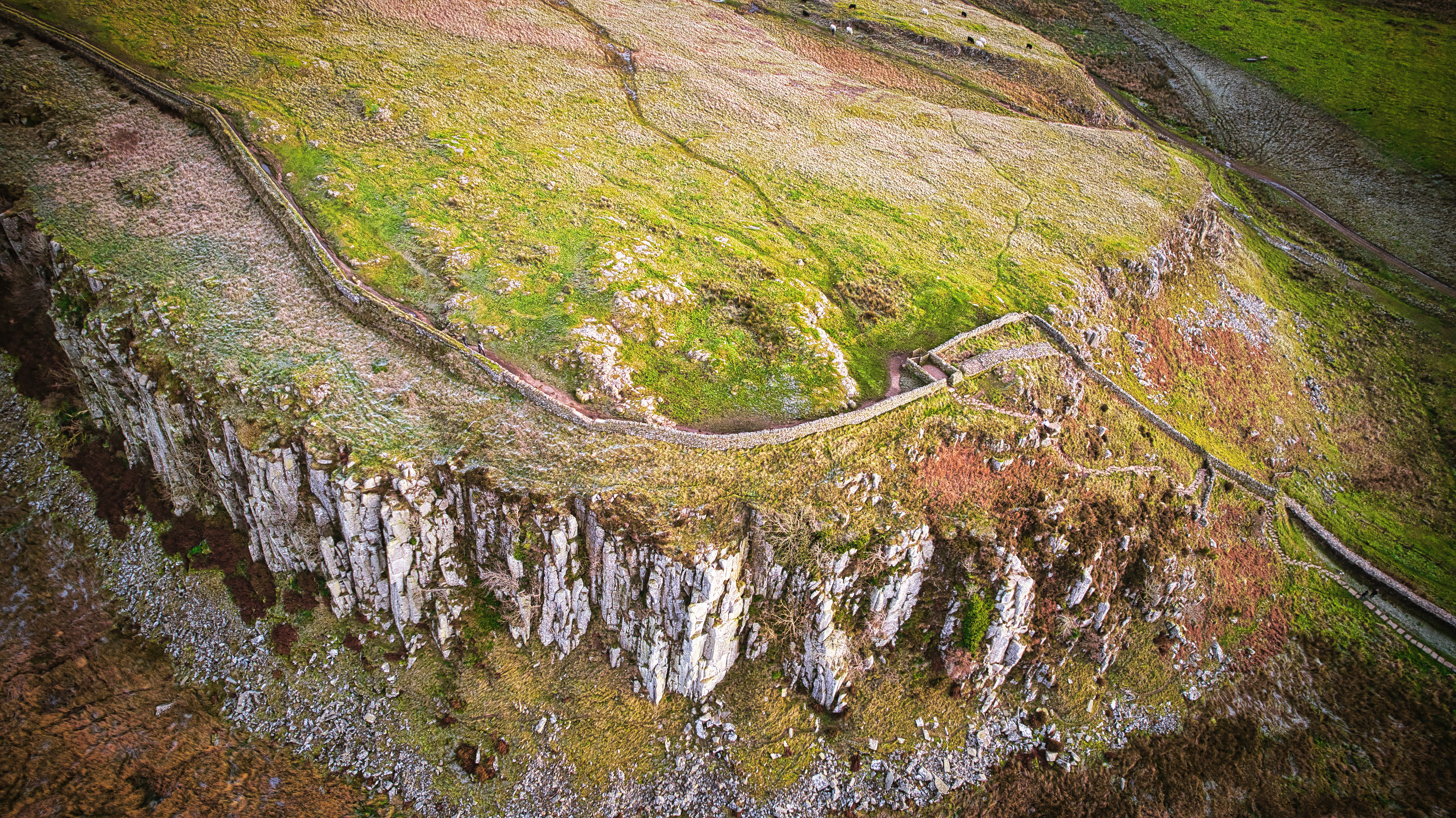Aerial view of a winding path on a lush green cliff with rocky edges at Sycamore Gap, Northumberland, UK.