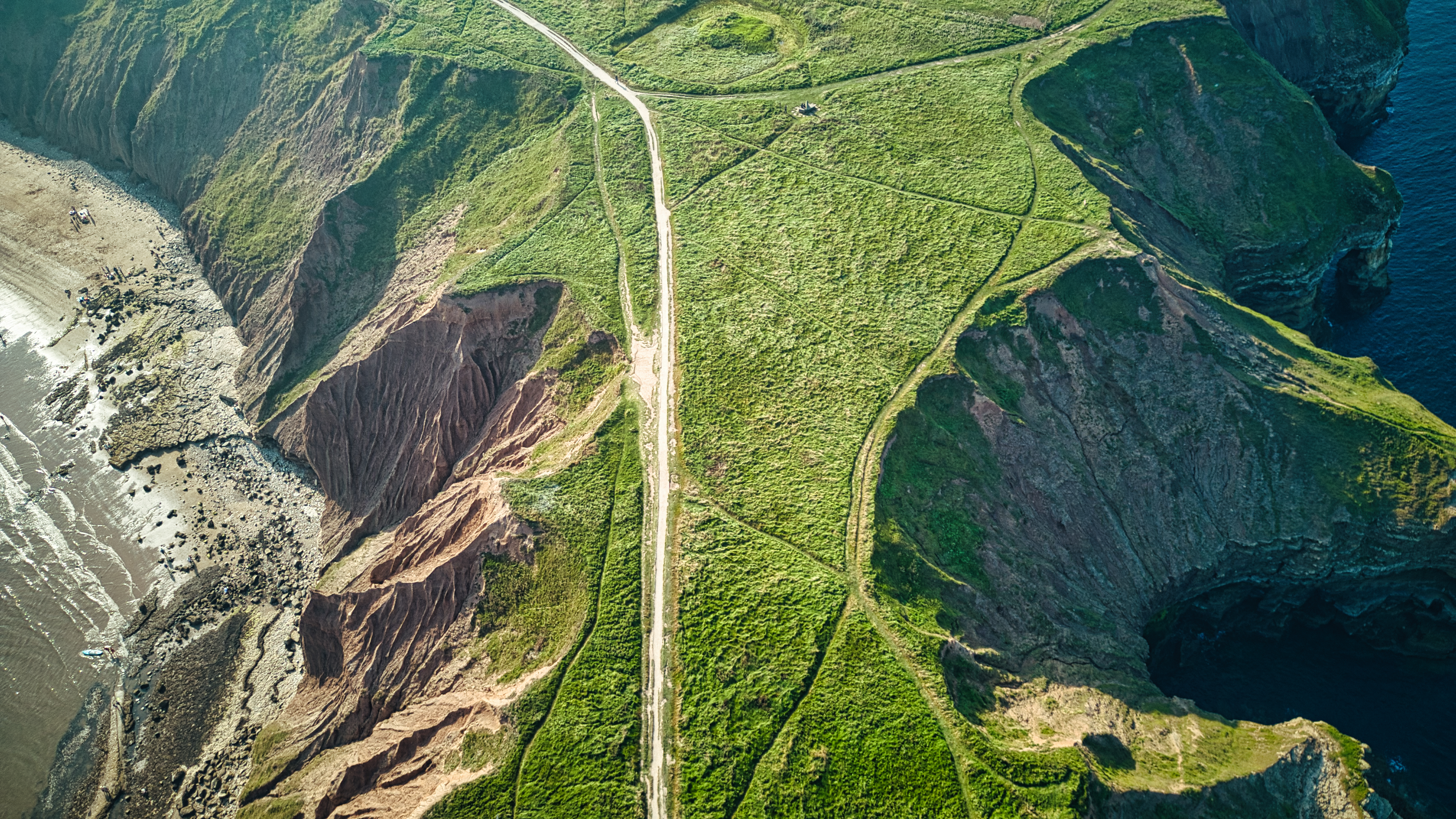 Aerial view of a winding road cutting through lush green hills with coastal cliffs and ocean in the background in Filey, England.