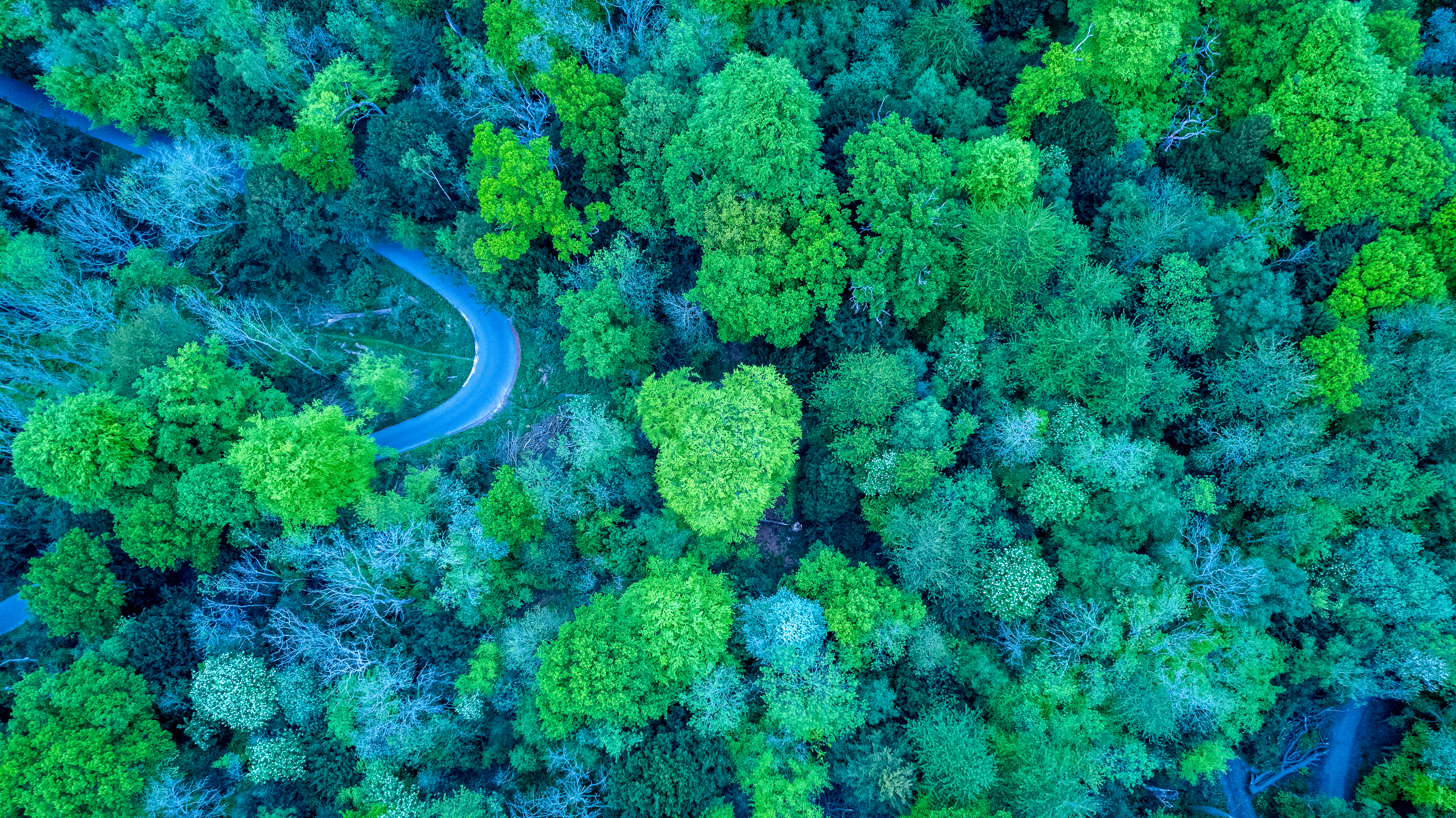 Aerial view of a winding road through a lush green forest, showcasing vibrant foliage and the beauty of nature from above.