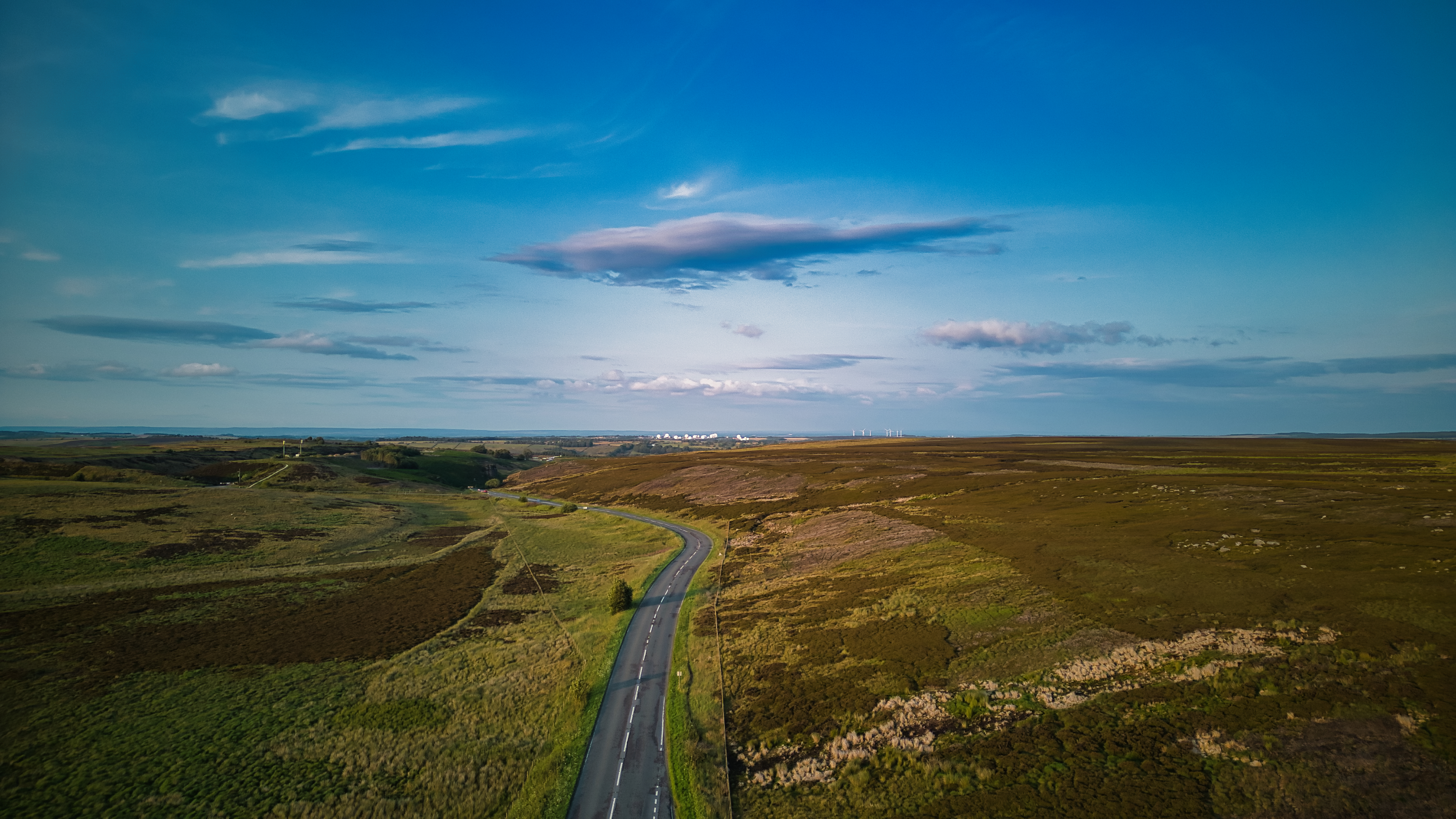 Aerial view of a winding road through a vast, open landscape with blue skies and scattered clouds in Yorkshire.