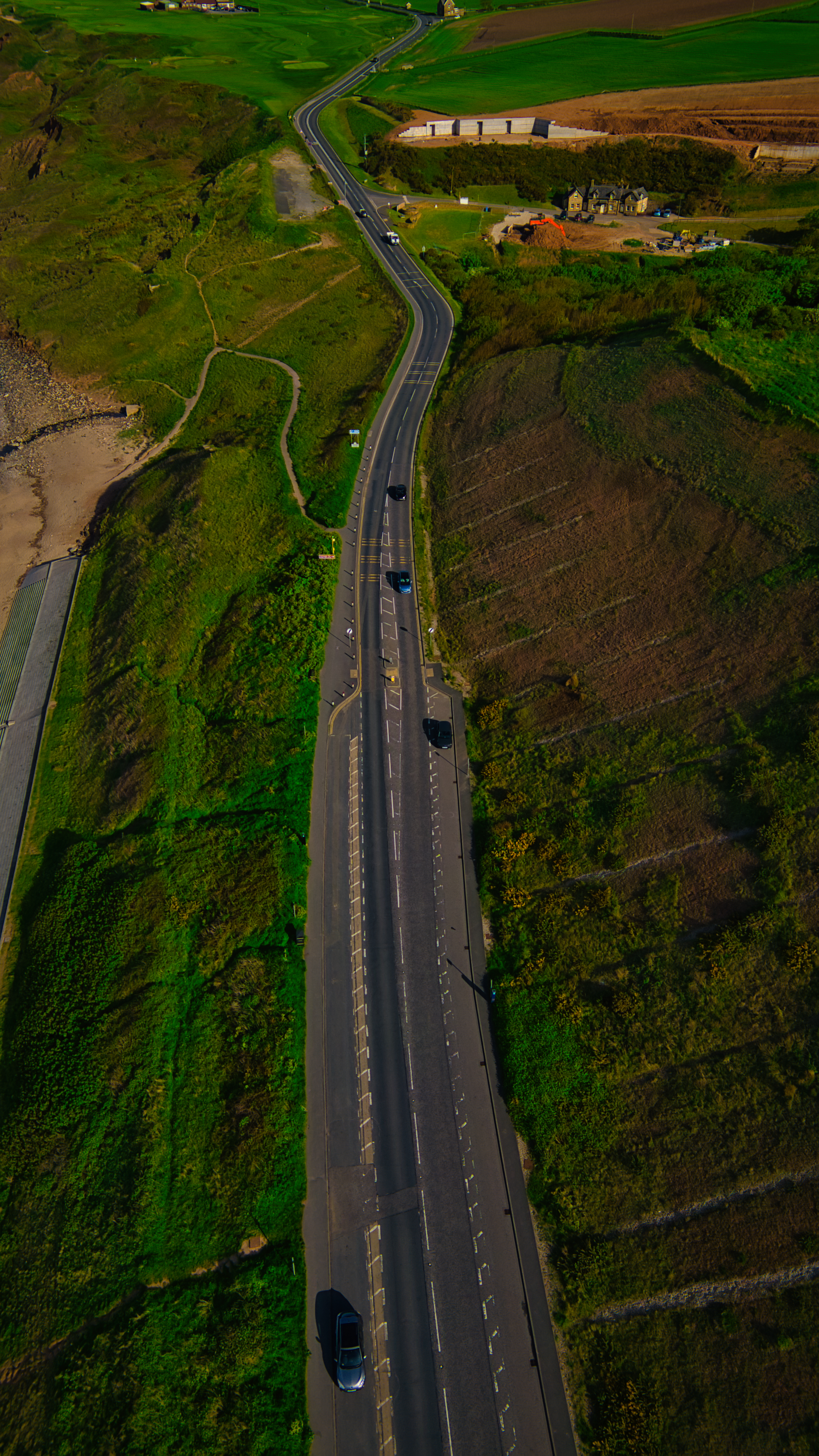 Aerial view of a winding road cutting through a green landscape with a few cars driving along it. The surrounding area includes fields and some buildings.