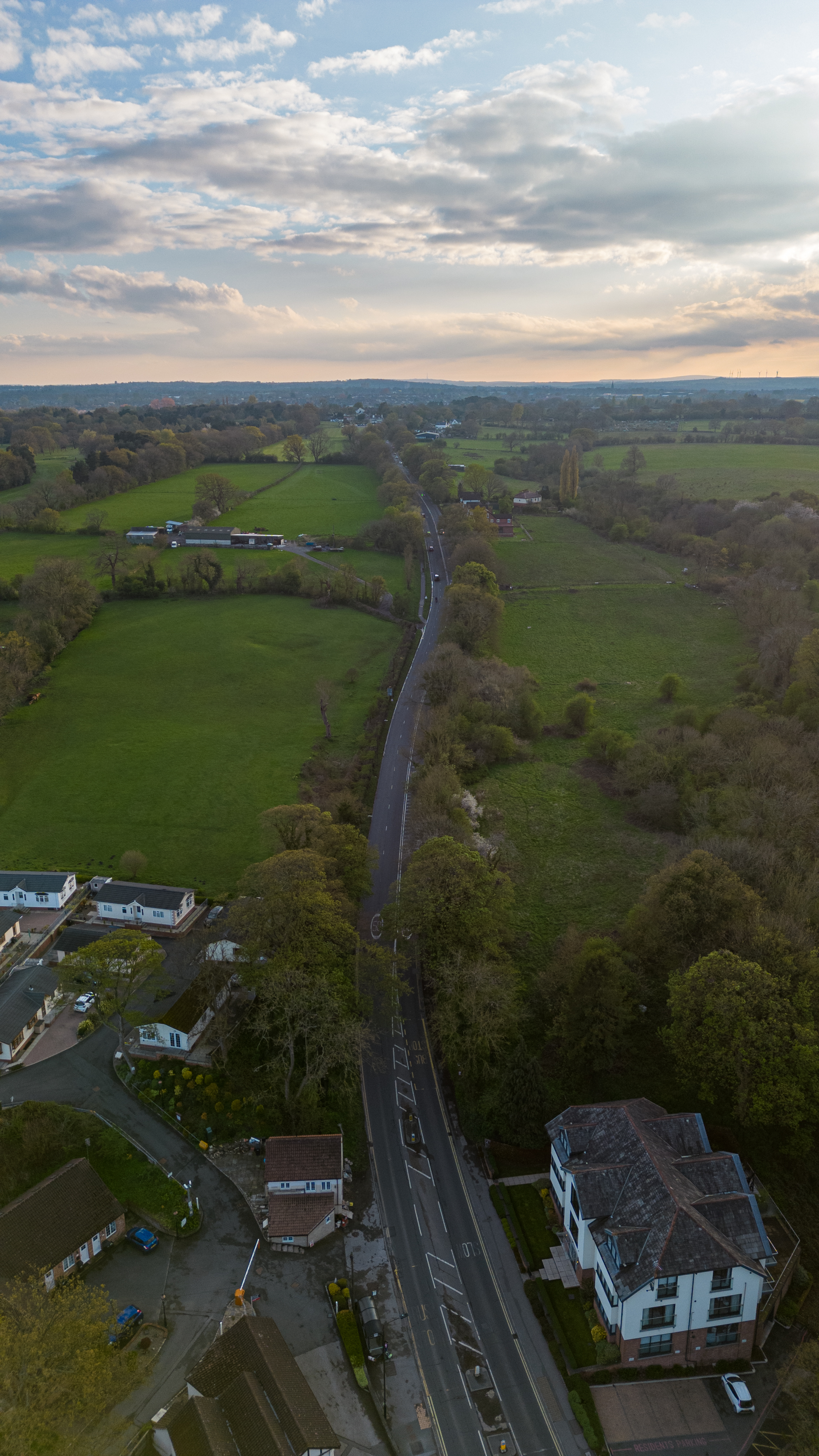 Aerial view of a winding road through lush countryside with residential properties at dusk in Knaresborough, North Yorkshire.