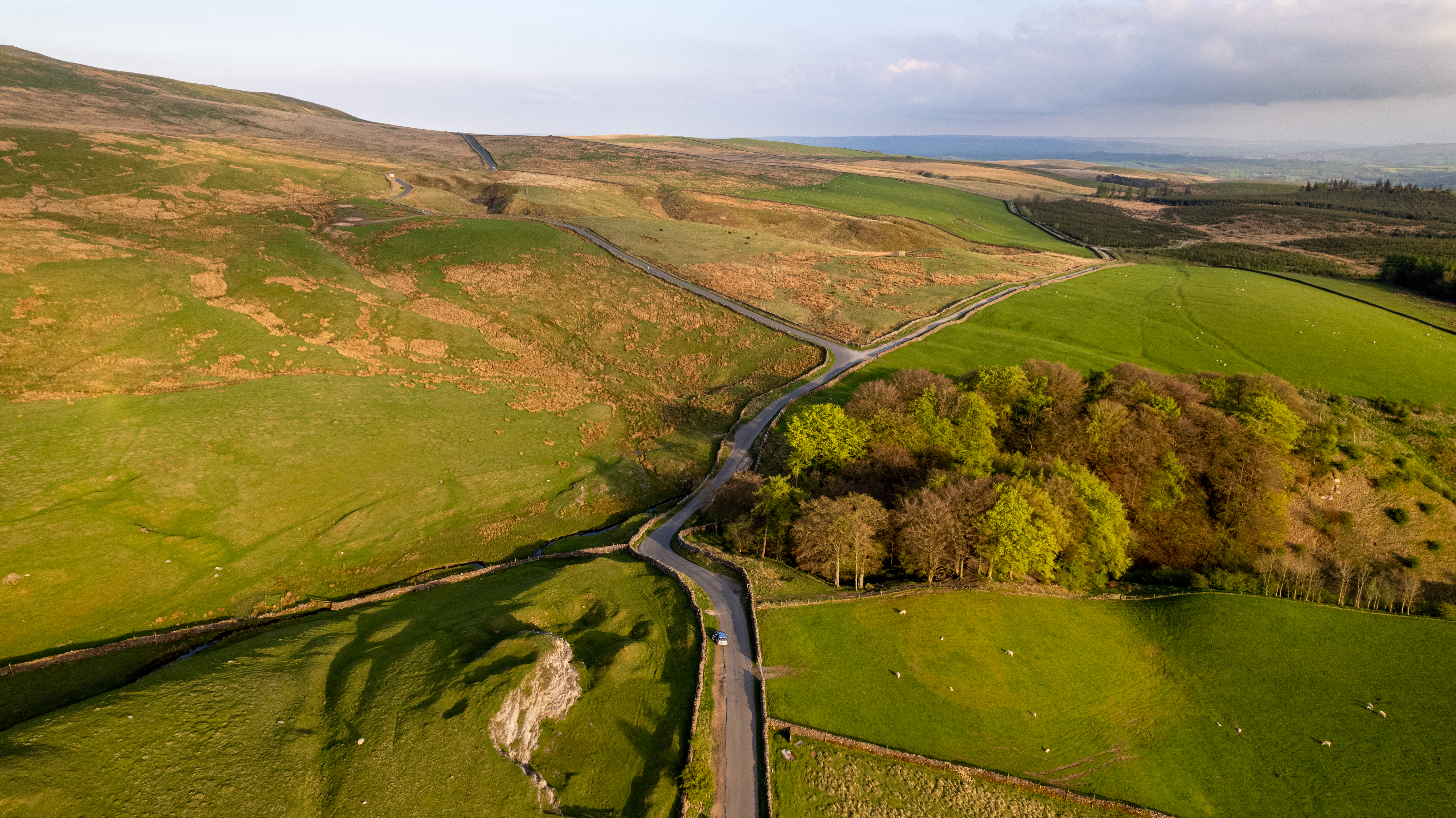 Aerial view of a winding road through lush green countryside with rolling hills under a soft evening sky.