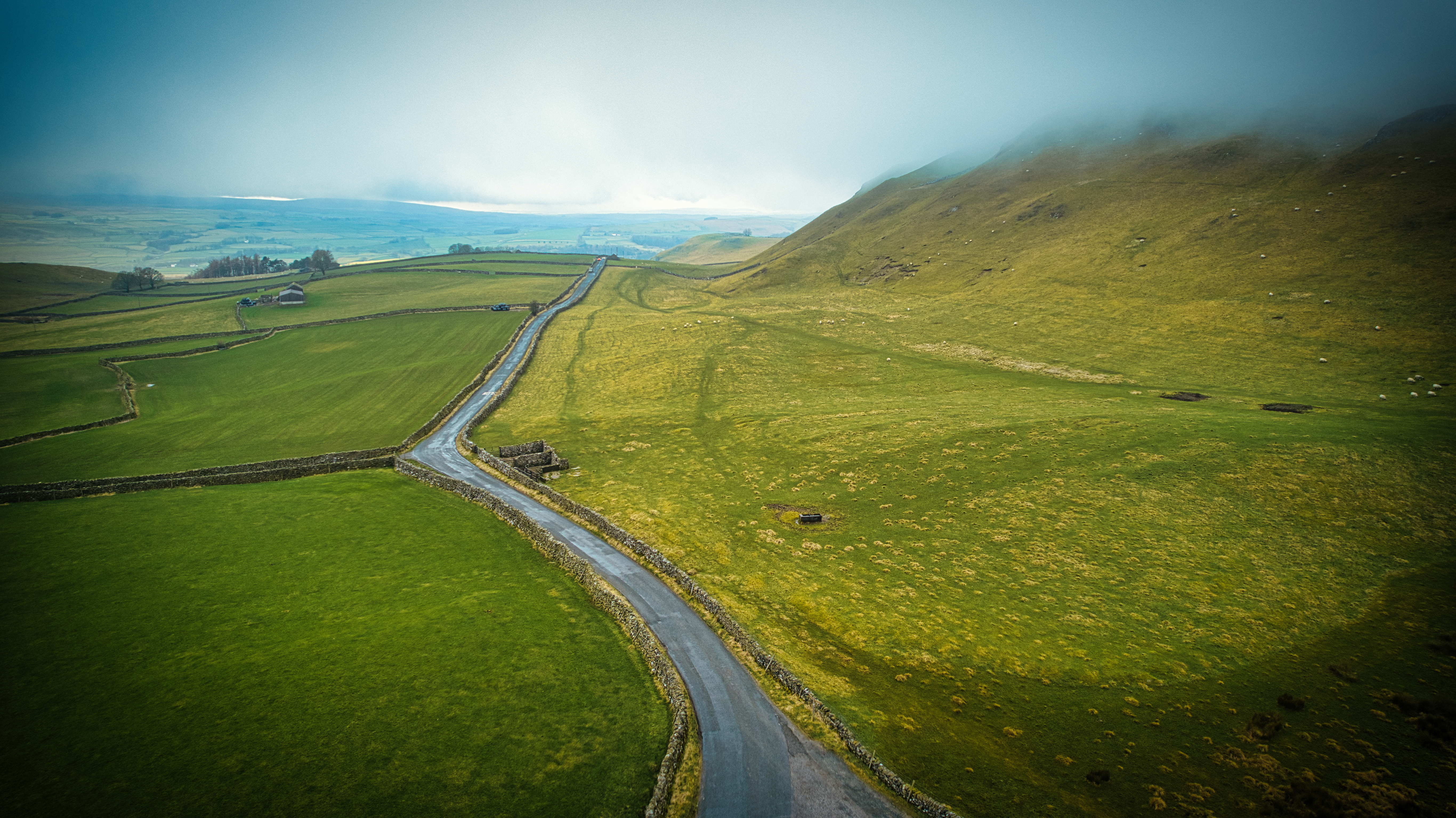 Aerial view of a winding road through lush green hills with mist and a glimpse of the ocean in the distance.