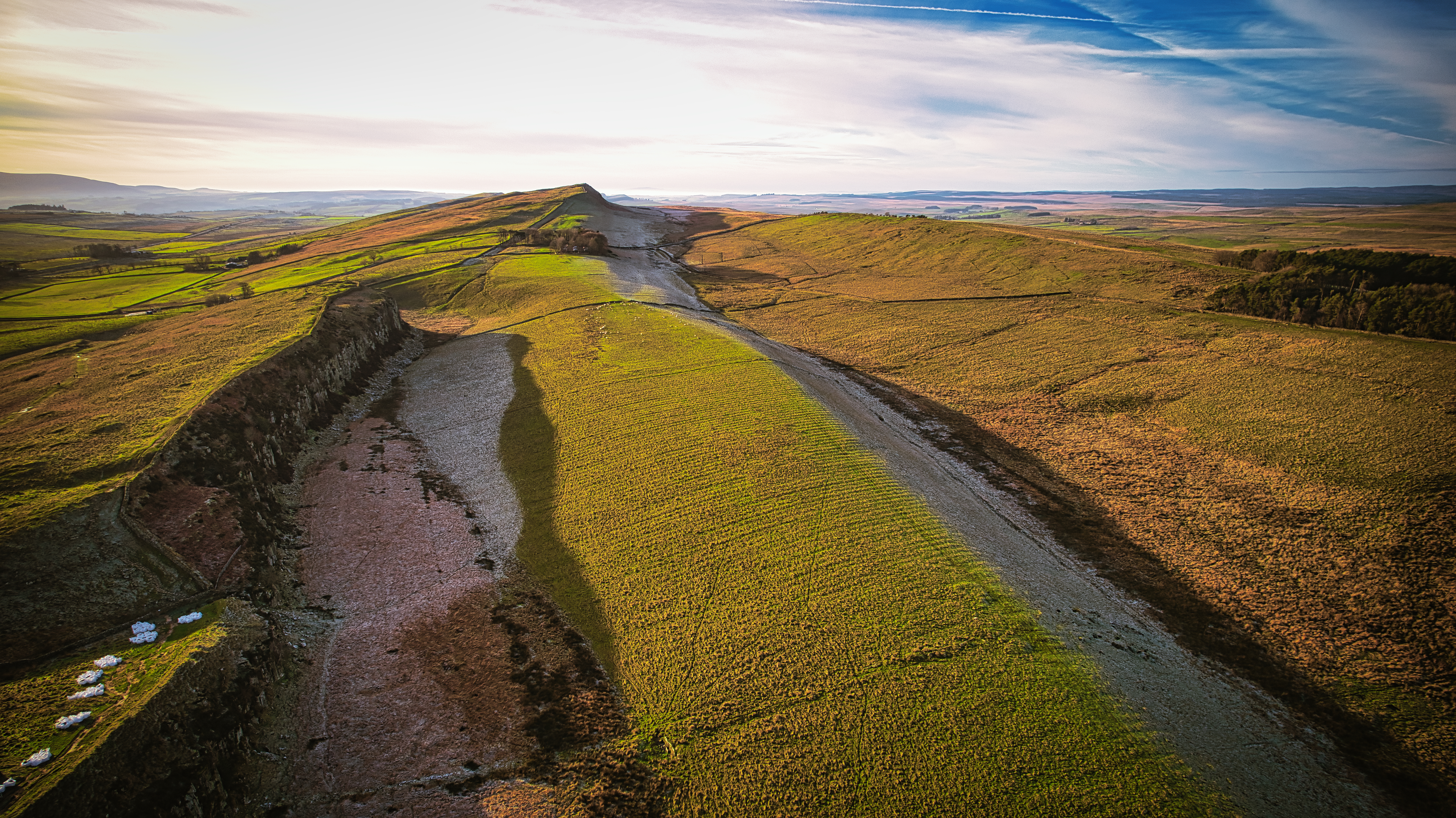 Aerial view of a winding road through rolling countryside hills under a vast sky at sunset at Sycamore Gap, Northumberland, UK.