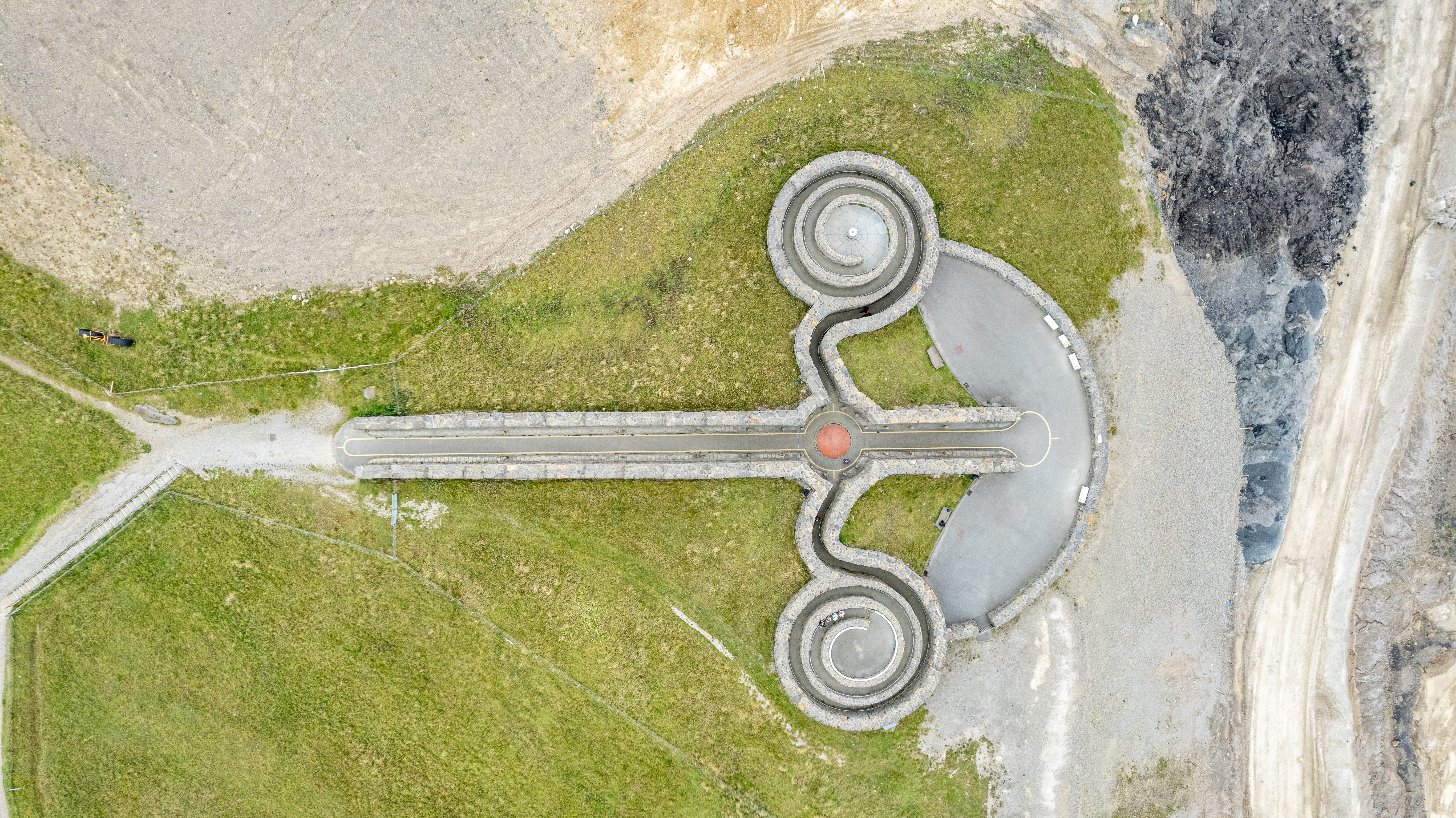 Aerial view of a winding tarmac path with loops on a grassy landscape, resembling a minimalist race track or a unique garden pathway.