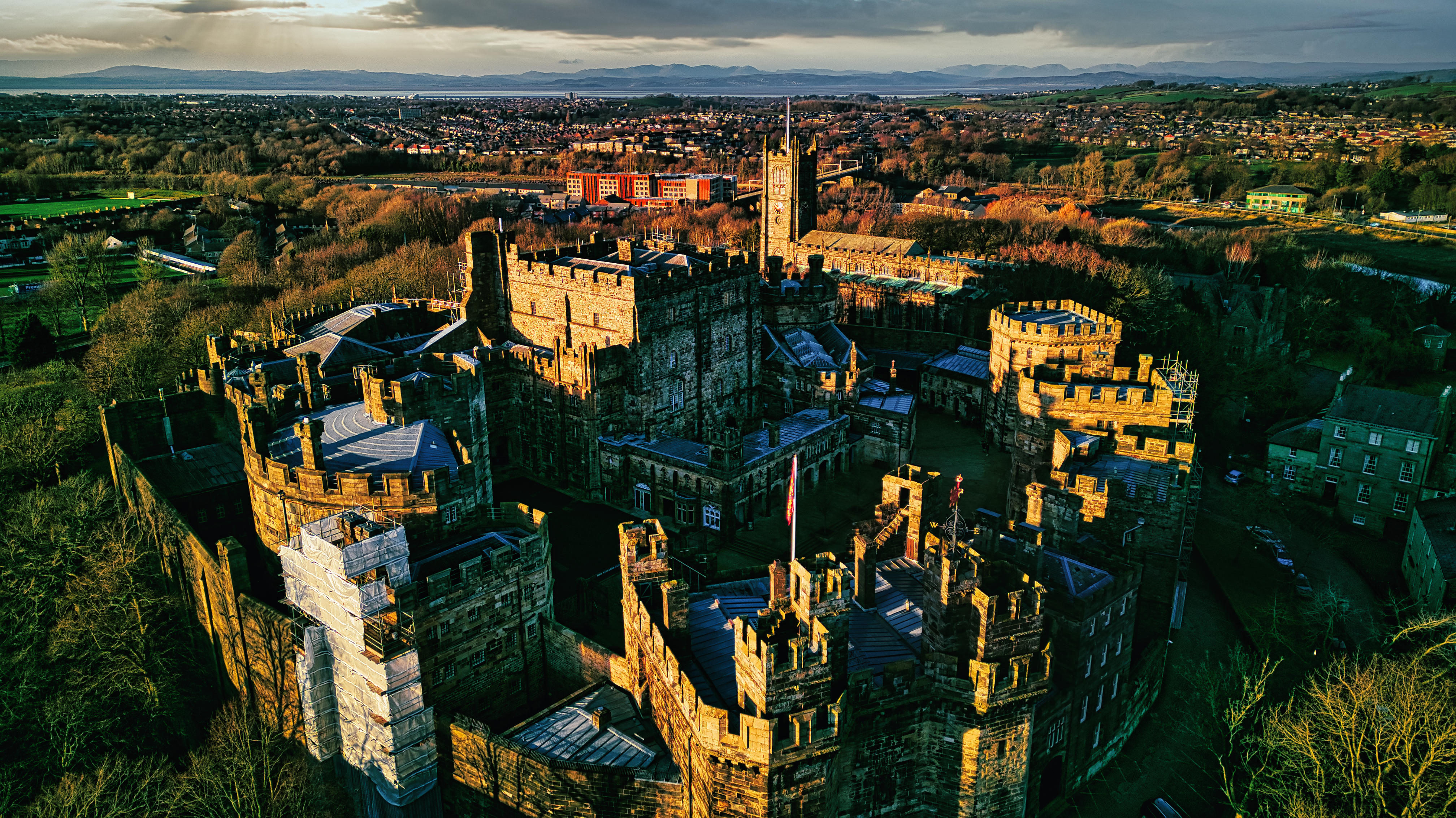 Aerial view of an ancient castle in Lancaster at sunset with lush greenery and a town in the background.