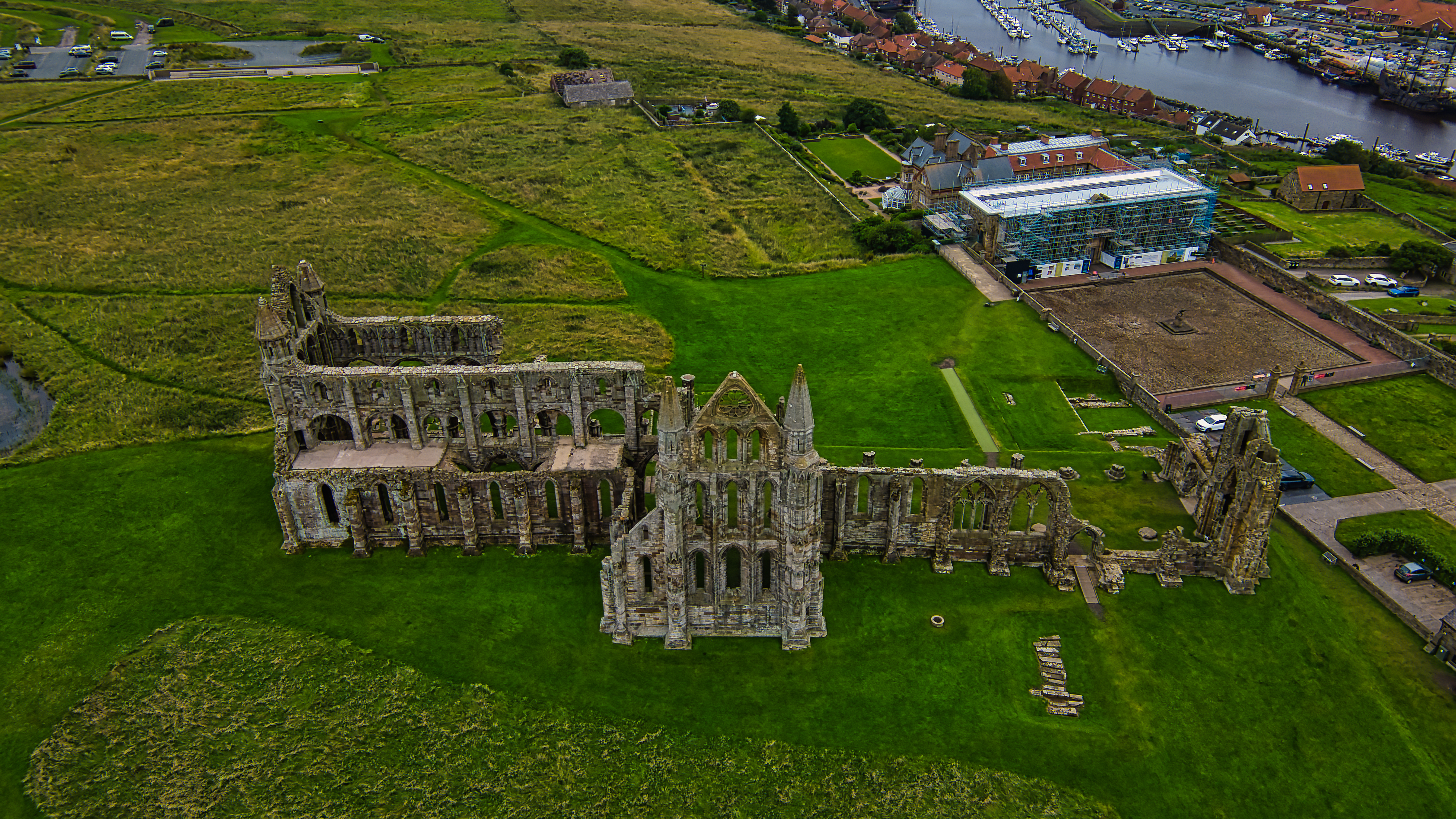 Aerial view of the ruins of an ancient abbey surrounded by green fields and nearby buildings.