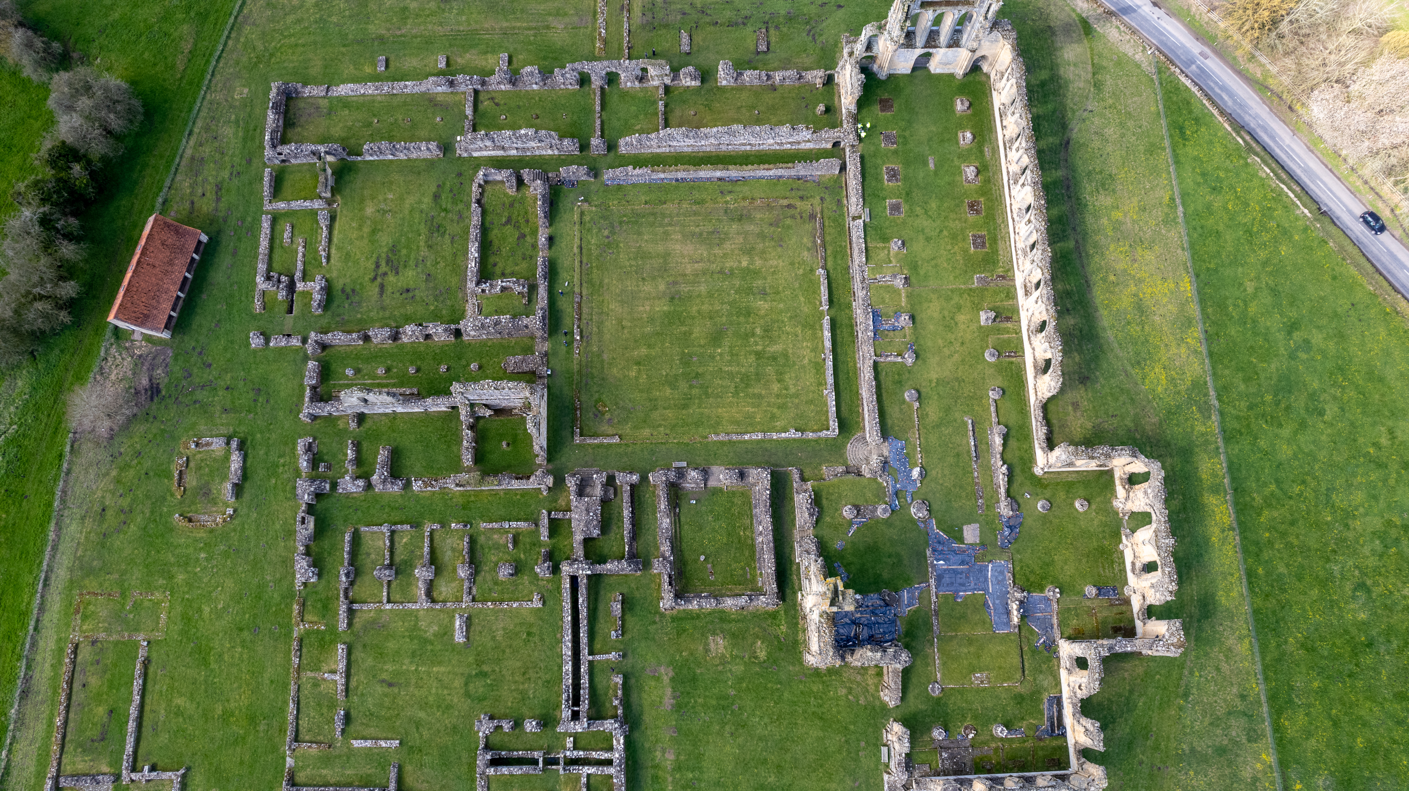 Aerial view of ancient ruins with green grass, showcasing the architectural layout from above.