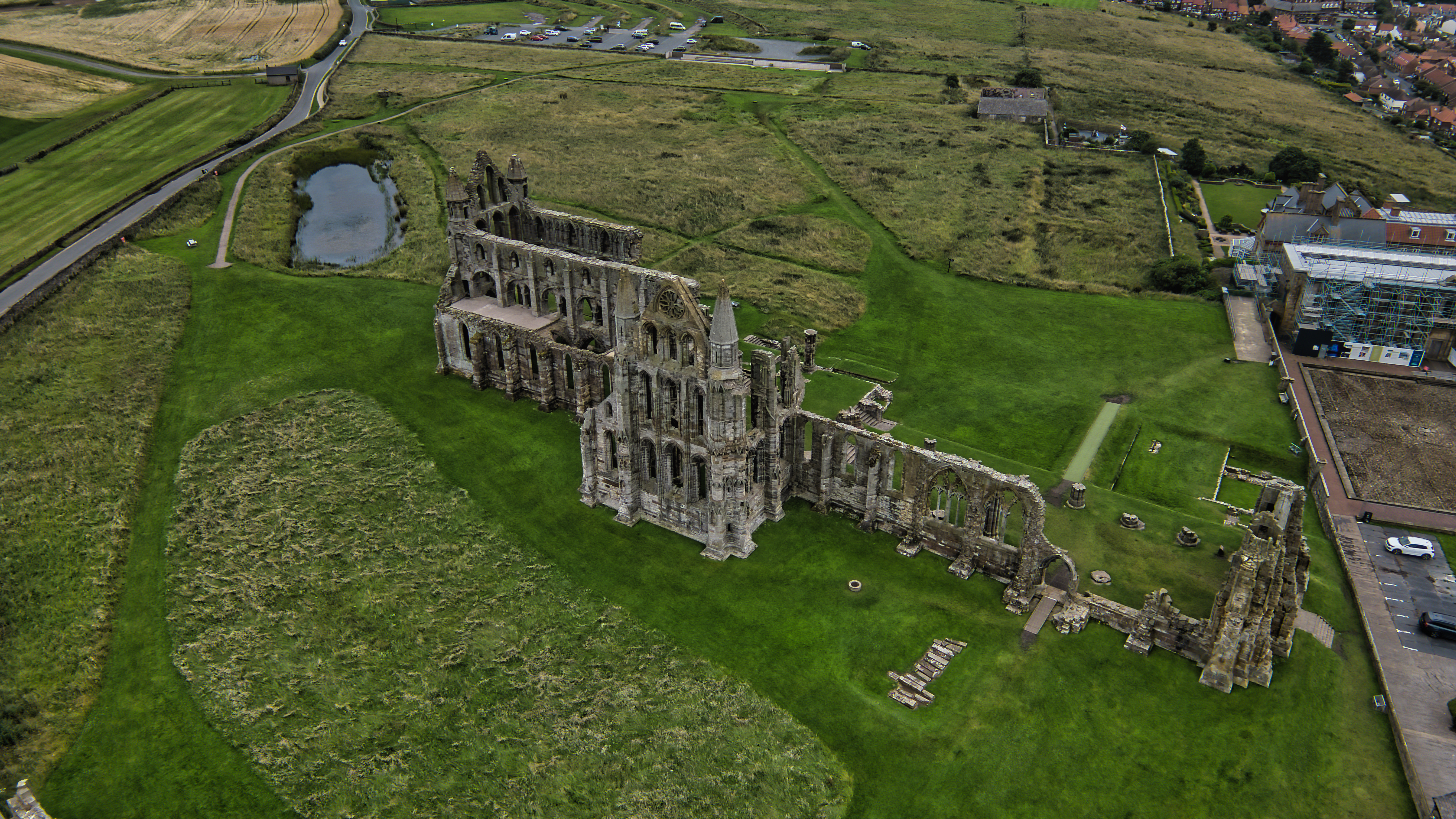 Aerial view of ancient ruins of a large stone building surrounded by green fields and a small pond. Nearby, there are modern buildings and a road.