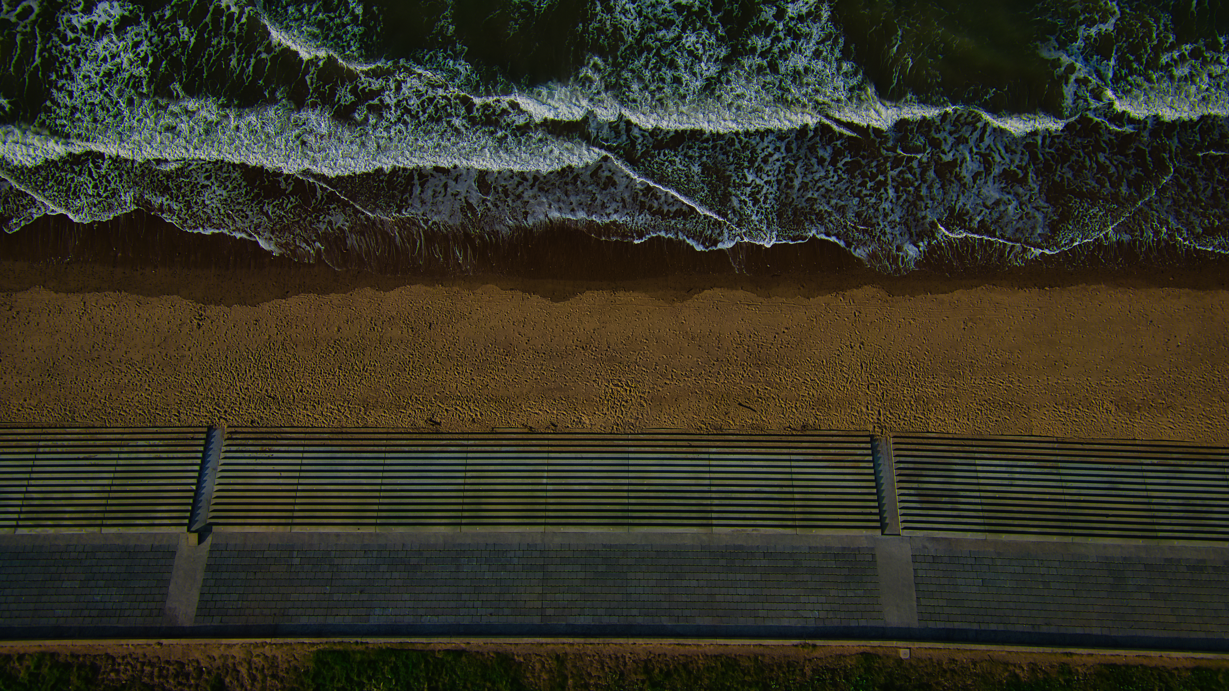 Aerial view of a beach with waves crashing onto the shore and a promenade with steps leading down to the sand.