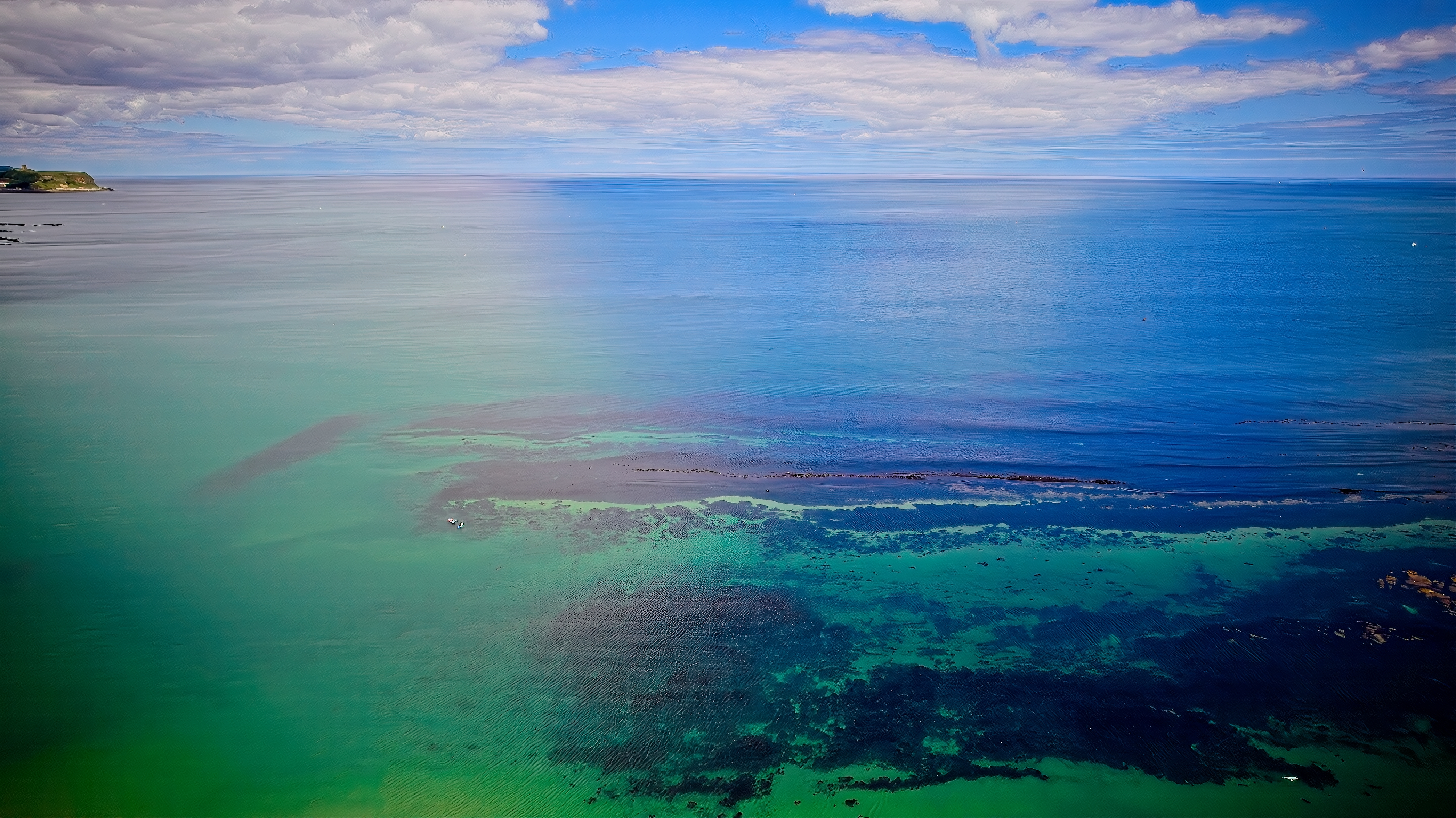 Aerial view of a calm ocean with clear blue and green water under a partly cloudy sky. The coastline is visible in the distance.