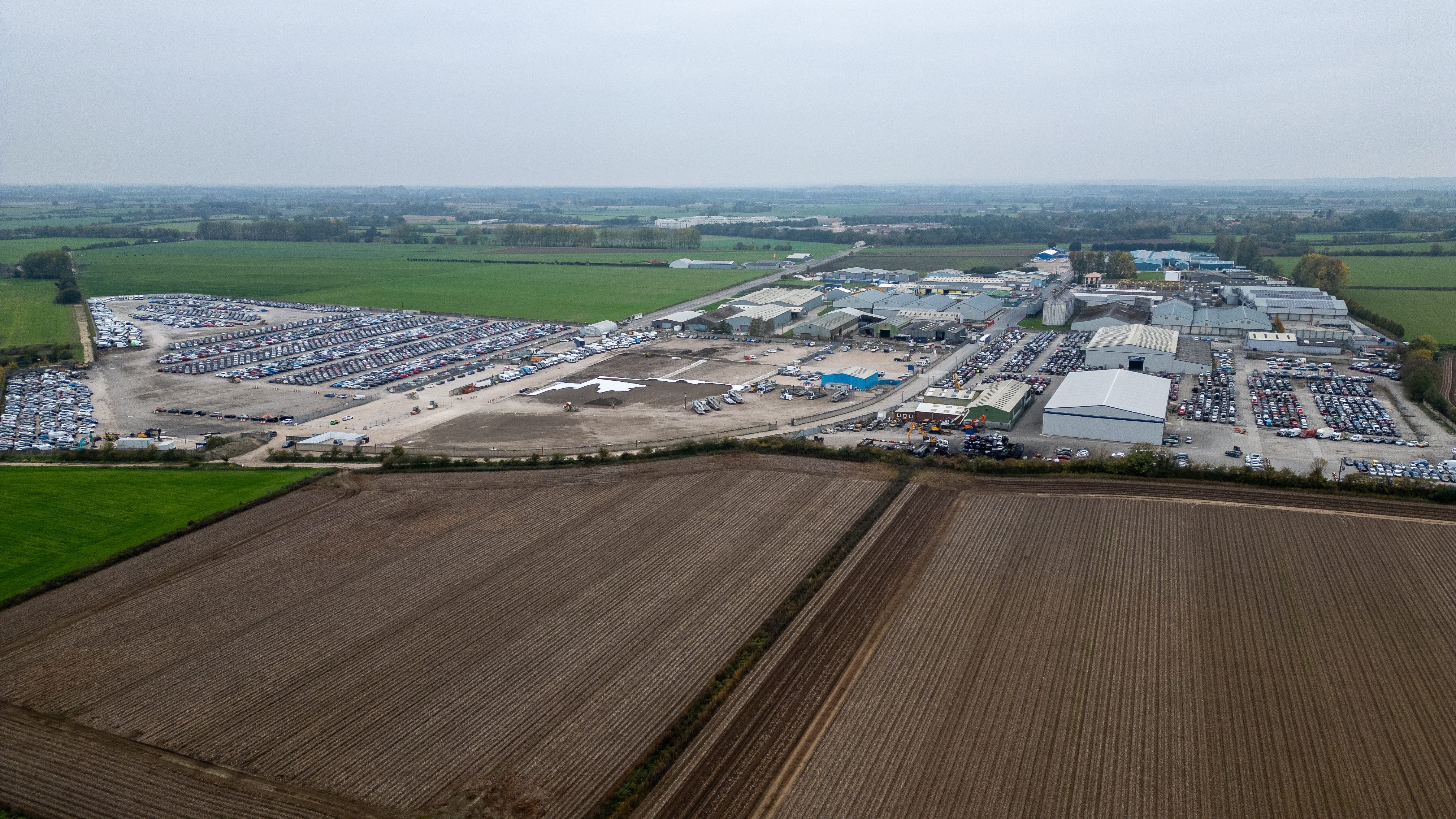 An aerial view of a car storage facility and industrial buildings surrounded by agricultural fields under an overcast sky at Full Sutton, York, UK.