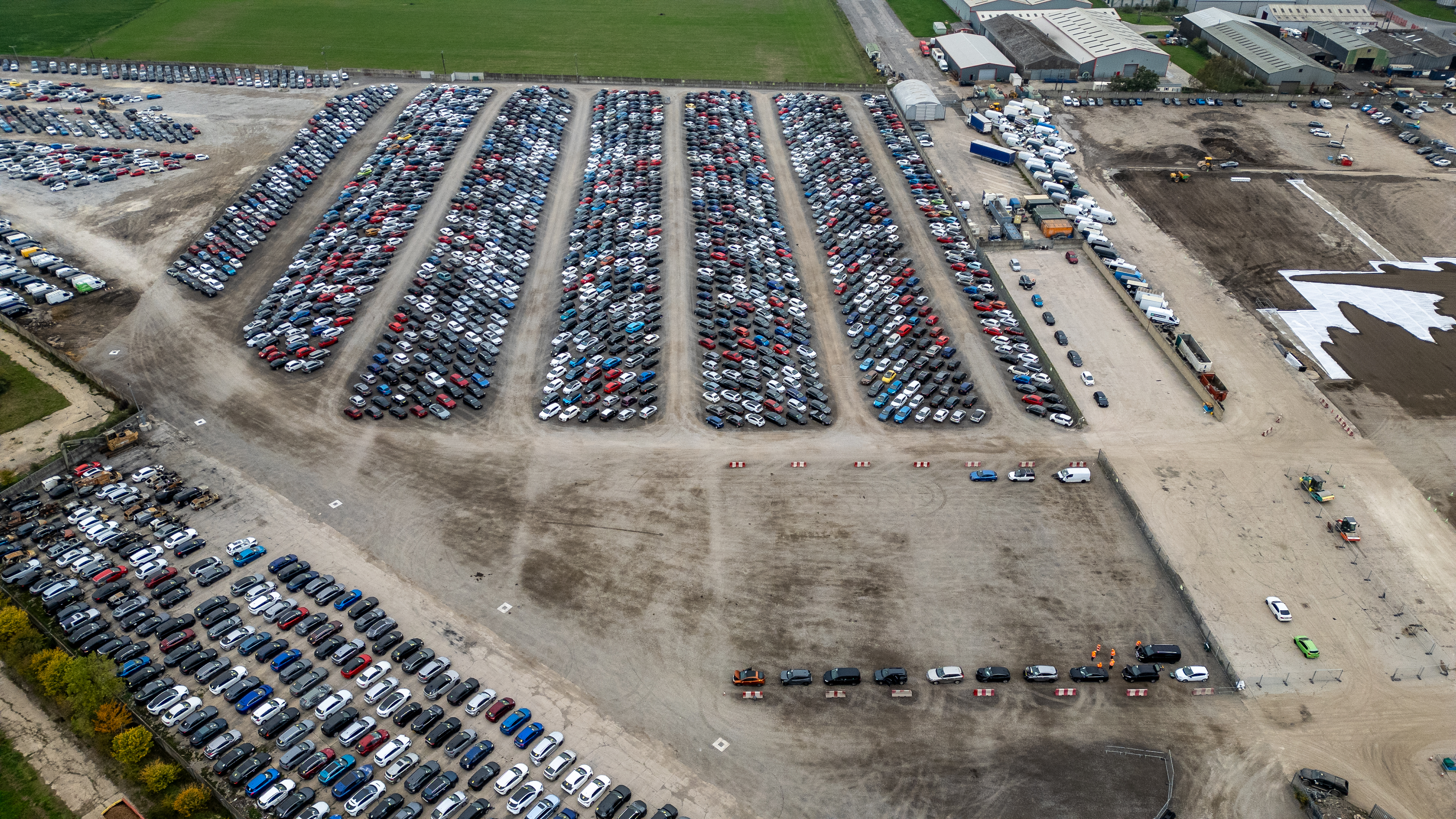 Aerial view of a large car storage facility with many rows of vehicles. Buildings and construction areas are visible at Copart yard, York, UK.