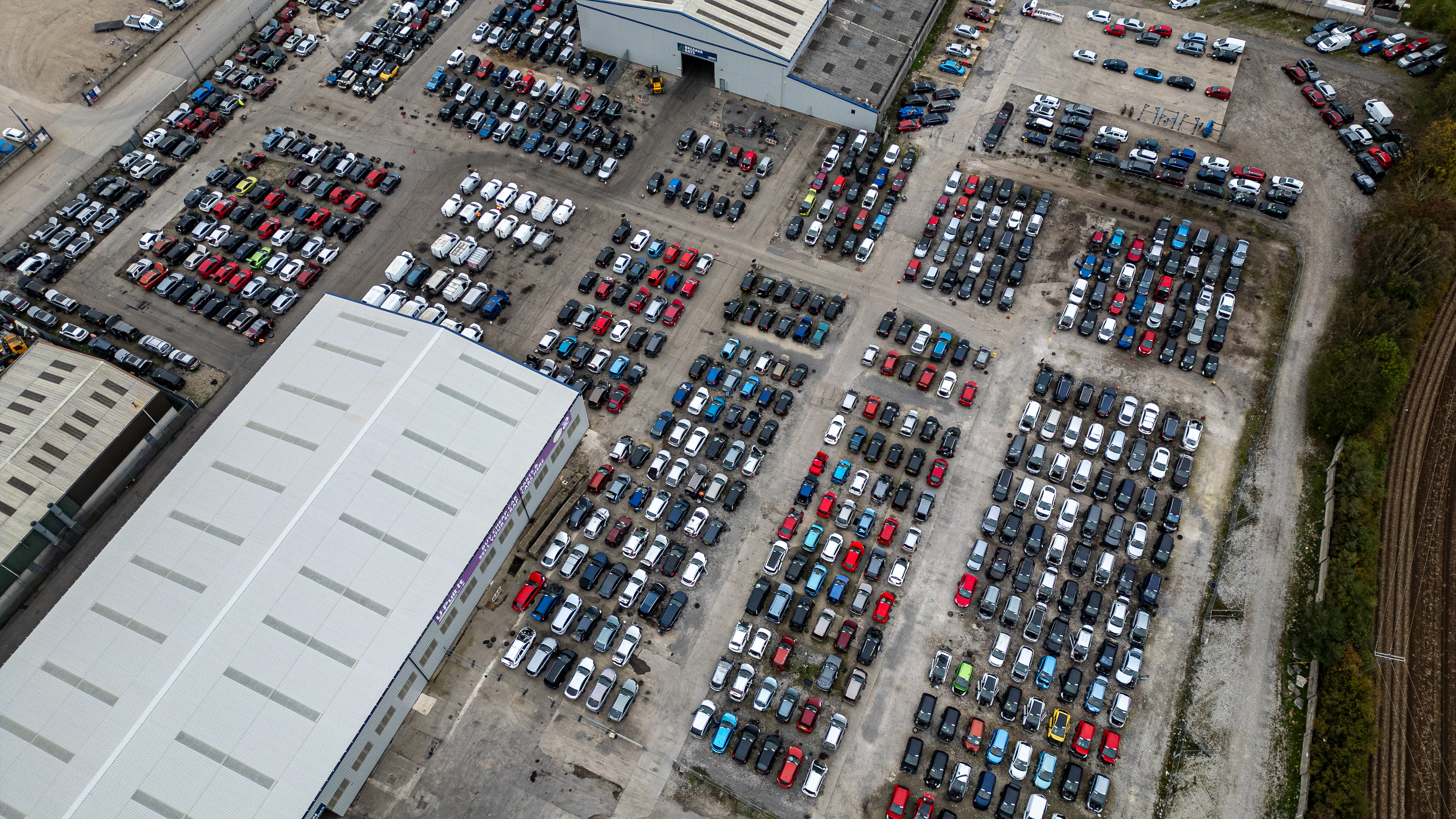 Aerial view of a large outdoor car storage lot filled with numerous parked vehicles, several buildings, and surrounding landscape at U-Pull-It York, UK.
